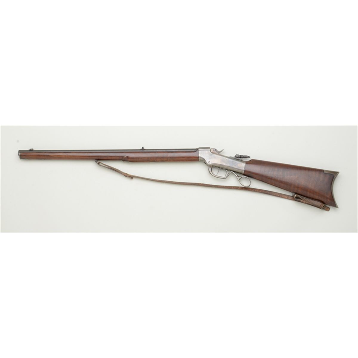 Custom rifle built on a Ballard receiver, single shot, falling block, double set triggers, .30-40 cal., 23-1/2” octagon barrel, custom wood stocks, adjustable Marble’s adjustable tang sight, #27420. Thisgun is in overall good condition showing re-finished blue on barrel, traces of case color on the receiver, double set triggers working at time of description, very good bore and action, very good wood; thin leather sling. Est.: $250-$500.