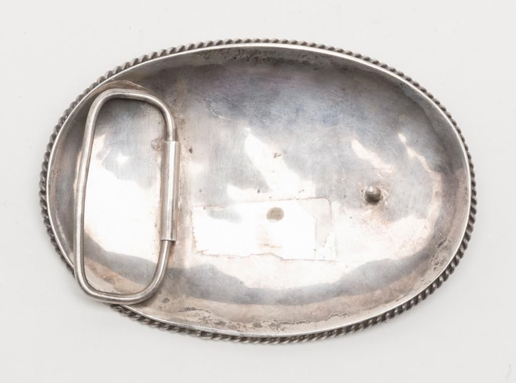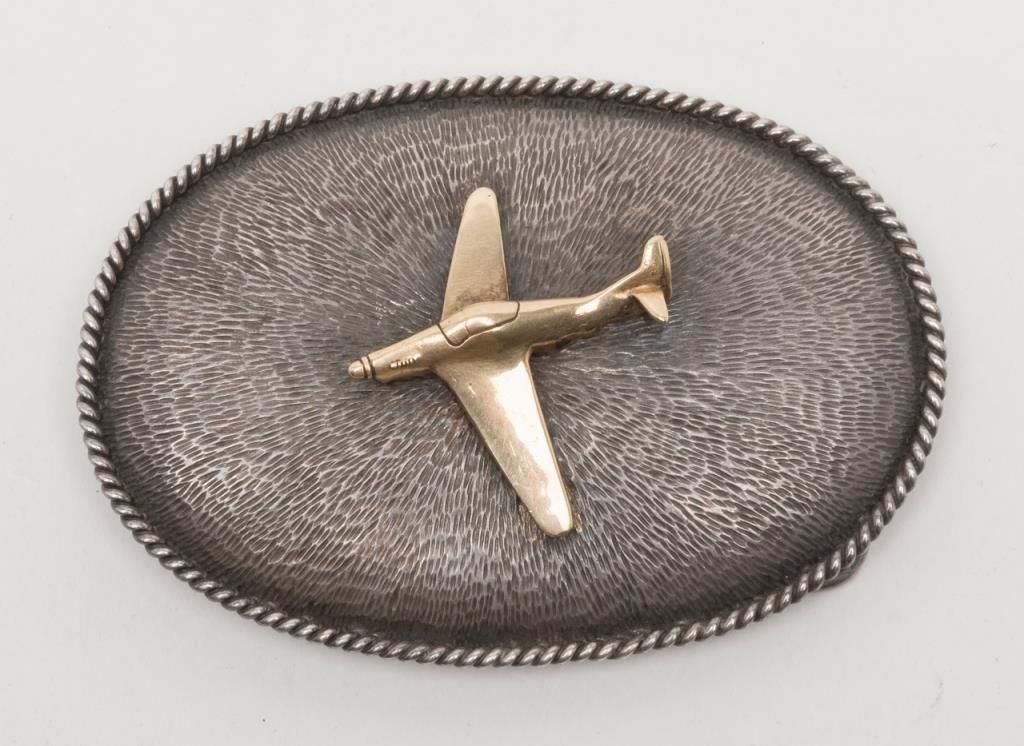 Custom silver and gold belt buckle in Western style circa 1950’s made for “Eddy” Edwards, WW II pilot of Mustang by tradition but no documentation available; Sterling and 14K. Est.: $300-$600.