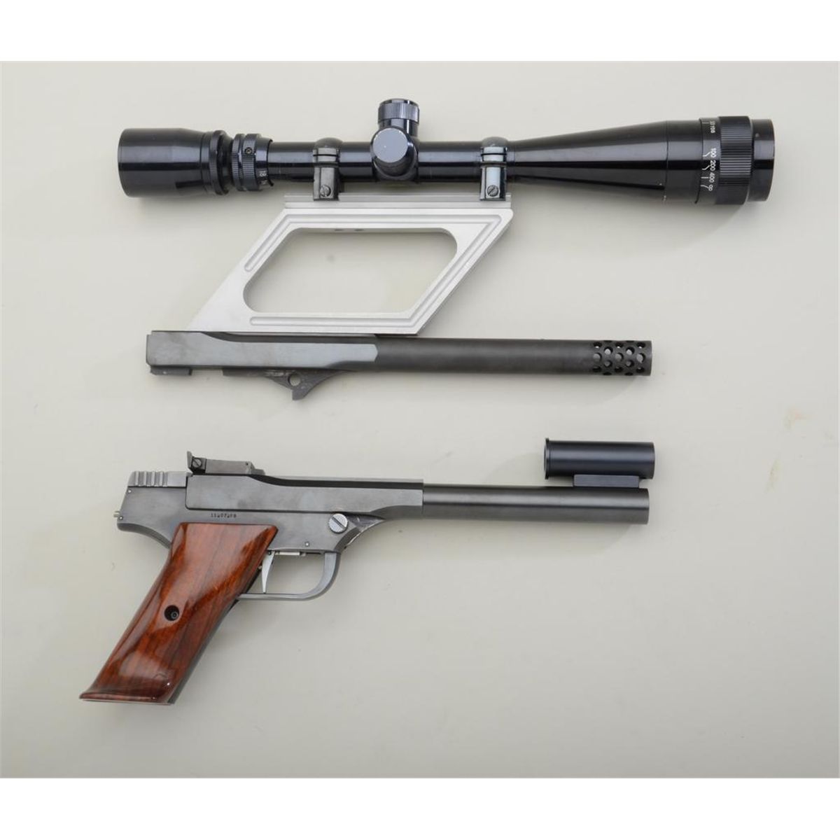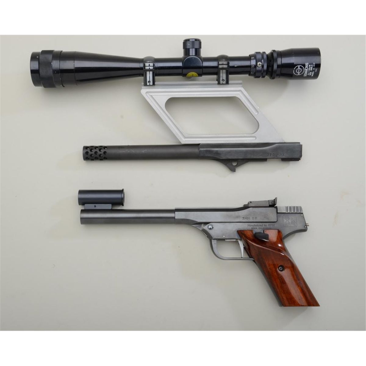 Custom single shot target pistol by RPM with extra barrel assembly and scope, 7mm BR cal., 10-3/4” barrel, black finish, custom wood grips, hooded front sight, #11307386. This gun is in overall fine condition showing themajority of its finish, very good to fine bore, fine grips; extra barrel is 12” overall with integral compensator, 7mm cal., matching finish to other barrel assembly with anodized extended mount for Simmons Model1031 scope; fine bore and clear optics in scope. Est.: $350-$700.