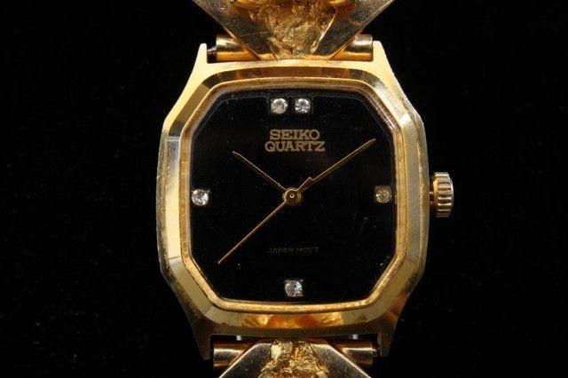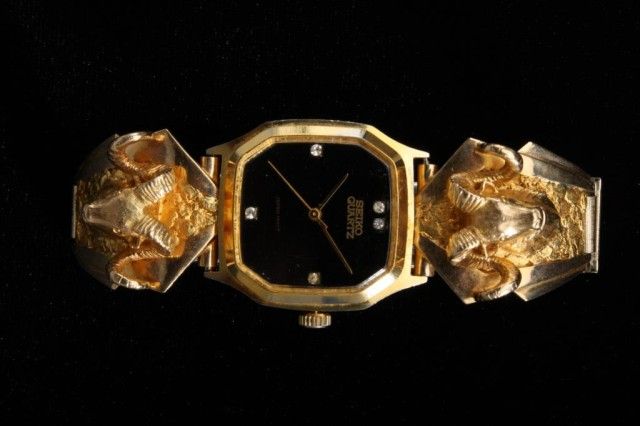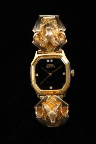 Custom sportsman’s watch featuring Sako quartz (Japanese movement) with 10 and 24kt gold cast sections showing big horn sheep surrounded by gold nuggets. Base gold is 10kt, the gold nugget appliqués are 22ktplus. The movement and expanding section are gold plated. The condition is fine to near excellent. Est: $600 - $1,200