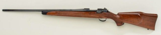 Custom stocked Sako RIIHIMAKI 222 caliber bolt action rifle with factory 24" standard weight barrel, serial #46567 made in Finland. The stock is select walnut with a fine striped grain similar to Kentucky rifles.The checkering and shaping of the stock by a master gunsmith on custom ordered by Robert Petersen whose initials are inlayed into a gold plaque on the grip cap. The forend cap and grip cap are select hardwoods. Thebottom of the forend is flattened and shaping of the stock is possibly attributed to Leonard Mewes who was well known in Los Angeles in the 1950's & 60's and worked thru Kerr's and the Hollywood gun shop. The buttplate is a milled steel and the rifle shows studs for detachable sling swivel. The bolt is jeweled, the trigger worked and every attention to detail was made. Fine to excellent condition as restored at time ofrestocking. Robert E Petersen collection. Est. $800-$1,600.