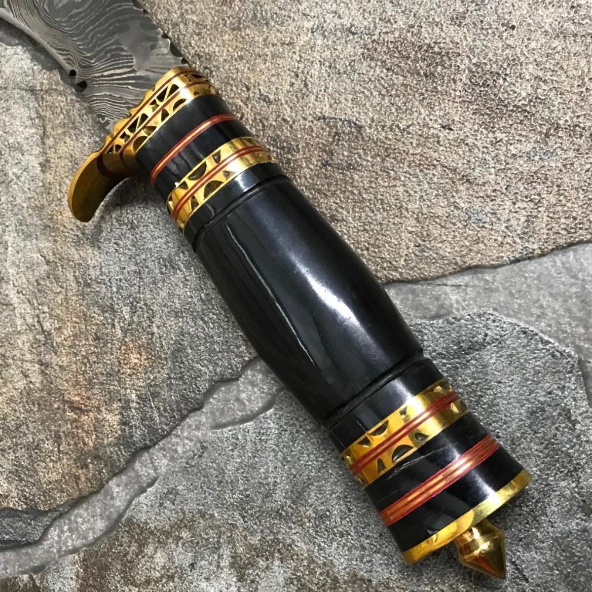 Custom-made Damascus steel hunting knife, Kukari, with exotic bullhorn handle, hand-forged above 216 layers of 1095 & 15n20 high carbon tool steels, with nickle layer. Excellent heat treatment to blade 56 To 57 Hrc. Leather sheath. Overall size 14" length. 9" blade. 5" handle. -10476-051418-EB-38972