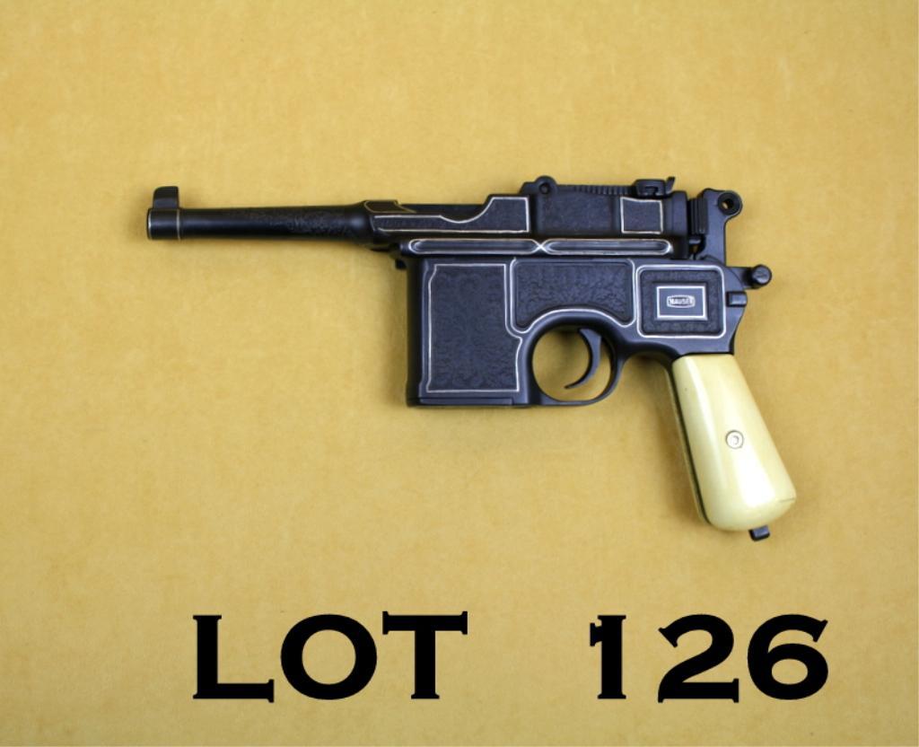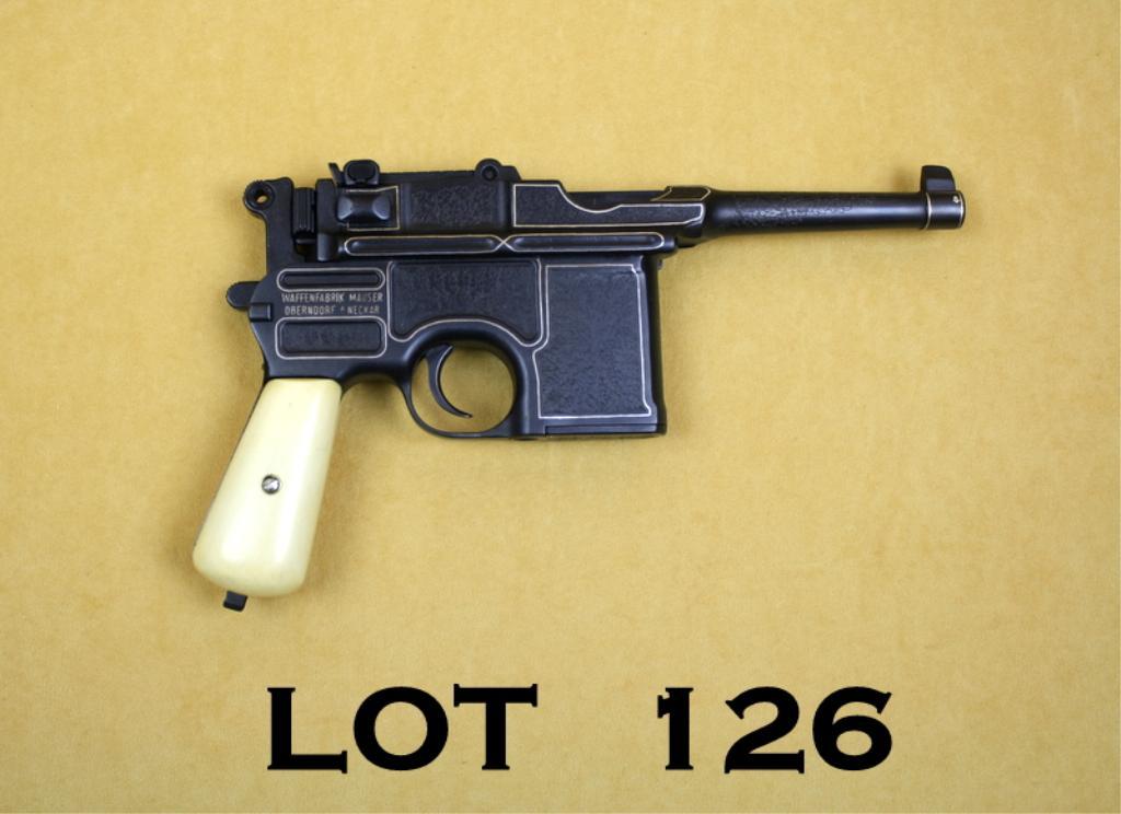 Customized Broomhandle Model Mauser late Post-war Bolo Model semi-auto pistol, 7.63mm cal., 4” barrel, engraved with silver accenting, re-blued finish, faux ivory grips, #676042. This gun is in overall good condition as customized showing the majority of its mat re-finish with tasteful extensive leaf engraving and silver accent bordering and frame maker’s marks, fair bore with some areas of pitting; good action, good faux ivory grips that are somewhat oversized. Est.: $750-$1,500.