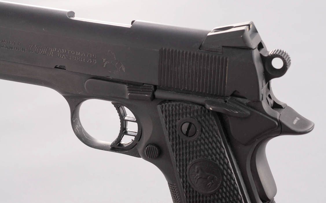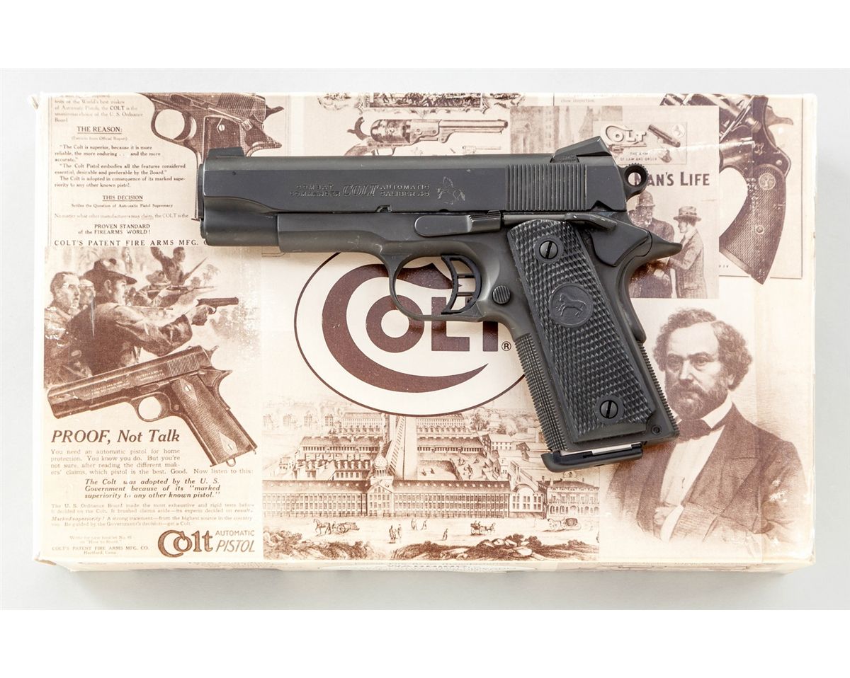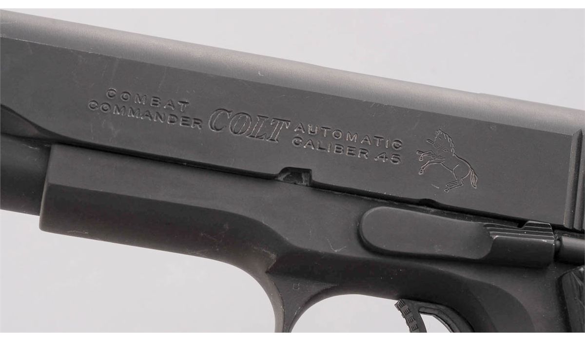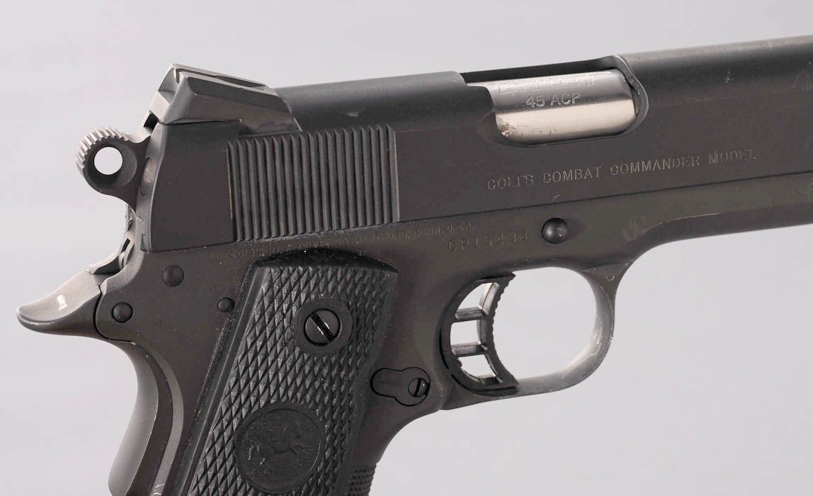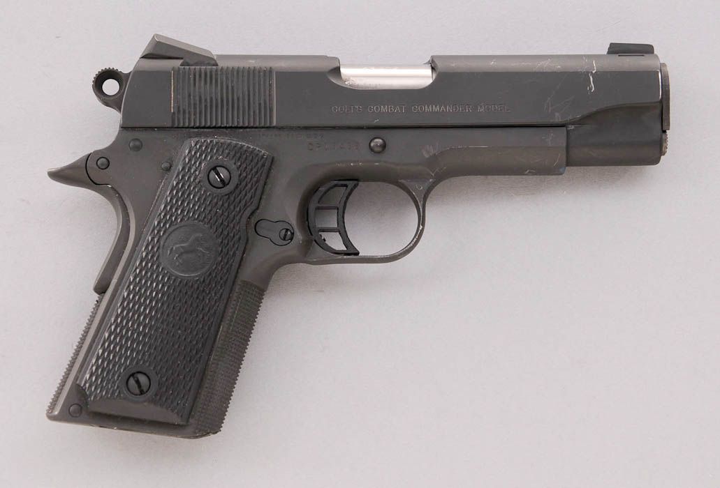 Customized Colt Combat Commander Semi-Automatic Pistol, #CP15438, .45 ACP cal., 4-1/4'' Briley barrel, parkerized finish, black rubber checkered grips with Colt medallions, hand-honed action, tuned trigger, checkered front strap and mainspring housing, custom trigger and beavertail safety, with Novak sights. In original box with two extra mags and Colt sleeve. Condition is excellent as modified showing light marks from handling. Est.: $750-$1,000. (Modern)