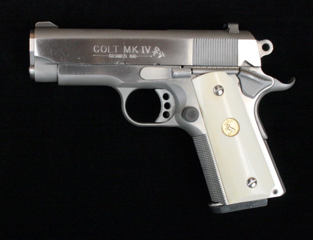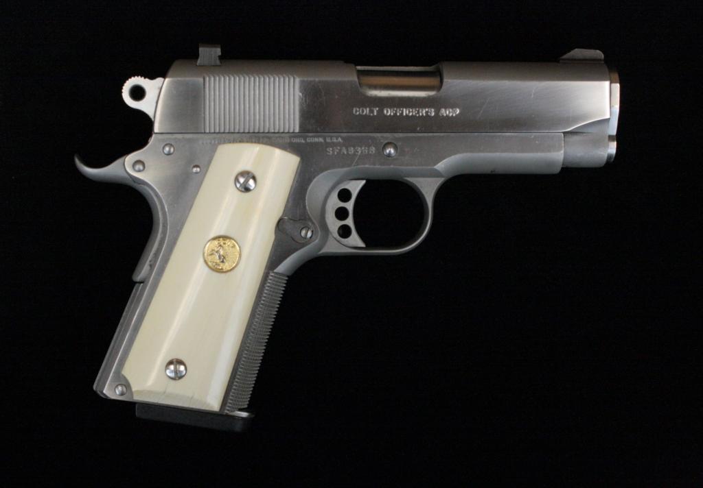 Customized Colt MK IV Series 80 Officer’s ACP semi-auto pistol, .45 cal., 3-1/2” barrel, stainless steel, factory Colt medallion ivory grips, #SFA8368. This gun is in overall fine condition as customized showing a lightenedand adjustable trigger, extended grip safety, stippled front grip strap, stippled and extended magazine release; fine bore, action and markings, beautiful grips, Pachmayr weighted magazine and an extra Colt bluedmagazine. Lots of special features on this one! Est.50: $500-$750.