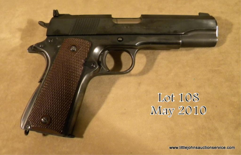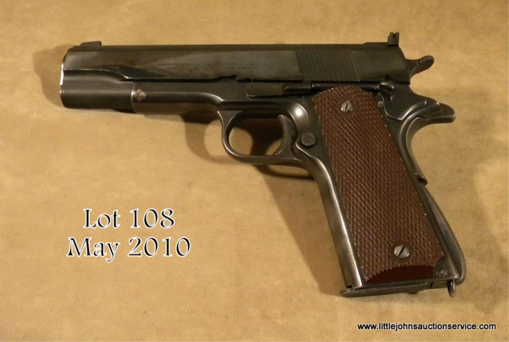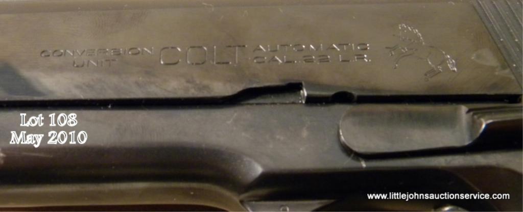Customized Colt Model 1911-A1 semi-auto pistol with Colt .22LR cal. Conversion Unit, blue finish, checkered brown plastic grips, #1620706. This gun is in overall very good condition as customized with the majority of an older re-blue to the frame with a spot of erosion/pitting on the front left side of the frame base and some wear to the front grip strap; the conversion slide is in overall fine condition showing approx. 98% original blue finish; excellent bore, crisp action, very goodgrips; adjustable rear sight. Est.: $500-$750.