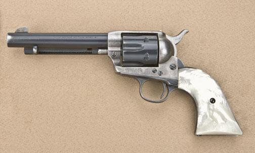 Customized Colt SAA revolver, .45 cal., 5-1/2” barrel, blue and case hardened finish, pearl grips, #193186. This gun has been customized, likely for Cowboy action shooting, with a first generation frame andlater Colt barrel and cylinder; customized cylinder pin; in overall very good condition as customized showing approx. 95% blue on barrel assembly and cylinder with case hardening on frame gone to a silvery finish,fine bore, crisp action and sharp markings; pearl grips are beautifully iridescent and in very good condition with several small edge losses with decent fit to this gun as customized. Est.: $1,000-$2,000.