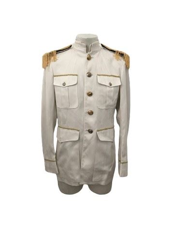 A white uniform jacket that has been customized by an unidentified movie studio wardrobe department to fit a background character. Apaulettes are velcro to be easily removed. Gold trim added to top of pockets and cuffs. Sewn in collar. Jacket length is 32 inches long and 15 inches from pit to pit.