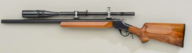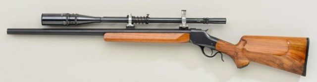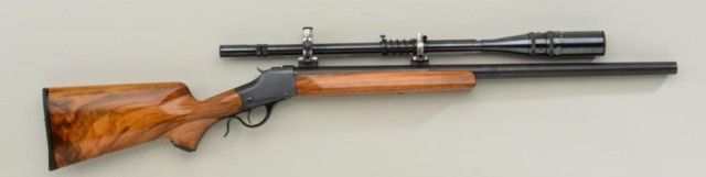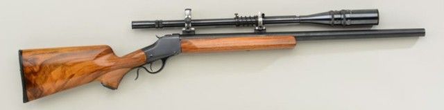 Customized Winchester Hi Wall Model 1885 single shot target rifle, .225 Win cal., 26-1/4” heavy round target barrel, mat black finish, custom target wood stocks, mounted with a Unertil tube scope and accompanied bya wood shooting box with dies, cases, manual, misc. loading tools,etc., #76824. Note from consignor’s estate indicates gunsmithing accomplished by Tony Heitz of Grants Pass, OR and Robert Voliva of Santa Rosa, CA. Thisgun is in overall very good to fine condition as customized with a fine bore, crisp action, majority of mat black re-finish remaining, beautiful custom wood stocks, hard rubber butt pad; Unertl scope has very goodoptics and is numbered 21589. A great looking target or varmint gun with shooting box of reloading goodies. Est.: $800-$1,600.