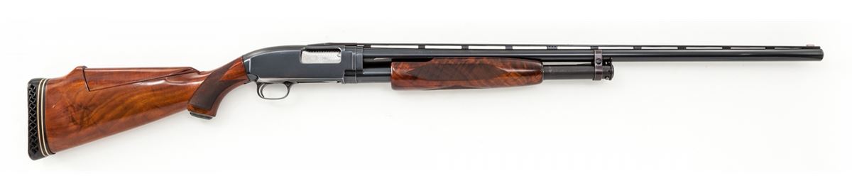 Customized Winchester Model 12 Slide Action Trap Shotgun, #1929286, 12 ga., 2-3/4'' chambers, blue finish , 30'' barrel with matted ventilated rib, front orange resin and middle white beads, Full choke, manual button safety in triggerguard, bright engine-turned bolt, carrier and extractor; engraved pigeon on lower receiver extension; replacement pistol-grip Monte Carlo stock and handle in high gloss finish AA figure Claro walnut with the original Winchester metal grip cap and height adjustable comb; 18-line-per-inch checkering. Length of pull: 14-5/8'' over 1-1/8'' black Pachmayr Whiteline ventilated recoil pad and spacer; weight is 9-1/4 lbs. Mfg'd circa 1961. Mechanical condition remains excellent showing only light use, bore is bright, action is tight, choke is opened to Modified; barrel reblue is 99% with scattered small scratches and oxidation, receiver blue has scuffs and assembly marks, bolt polishing is scuffed. Stock finish has light handling marks. Est.: $800-$1,200. (C&R)