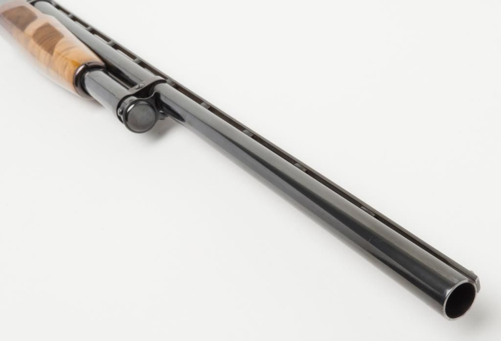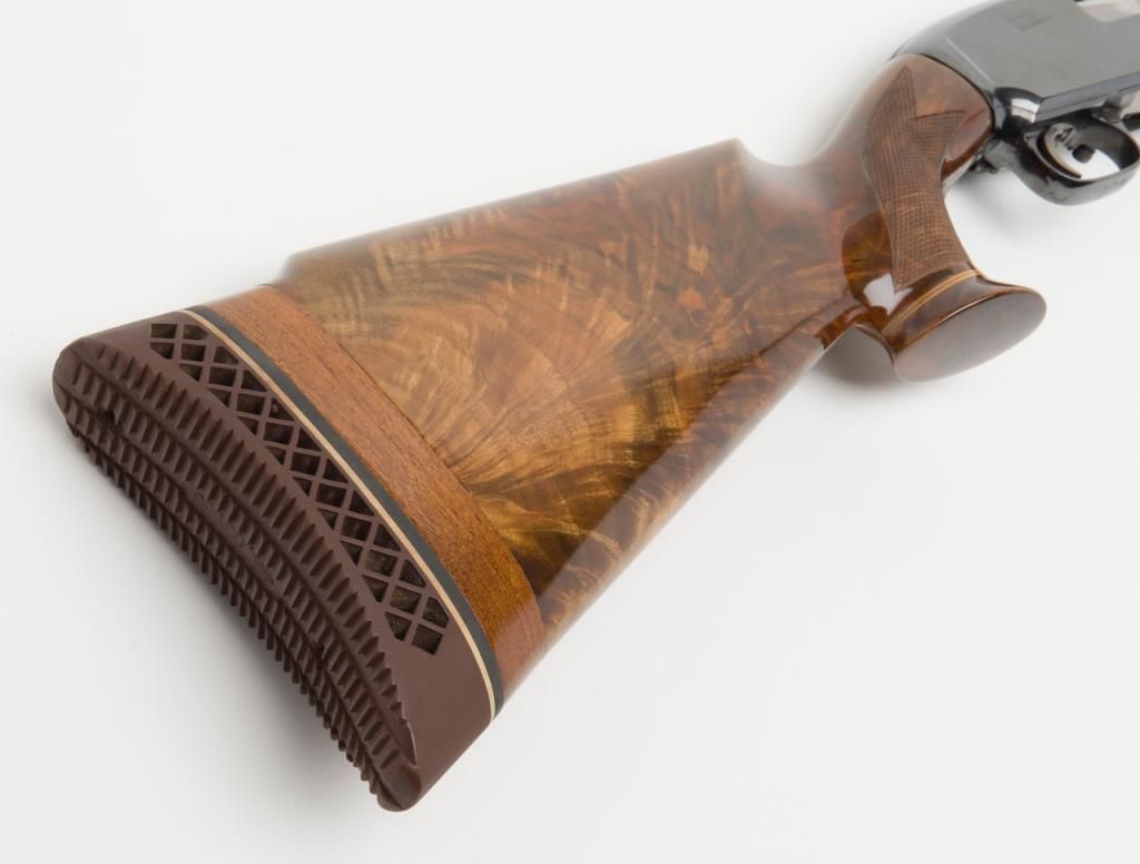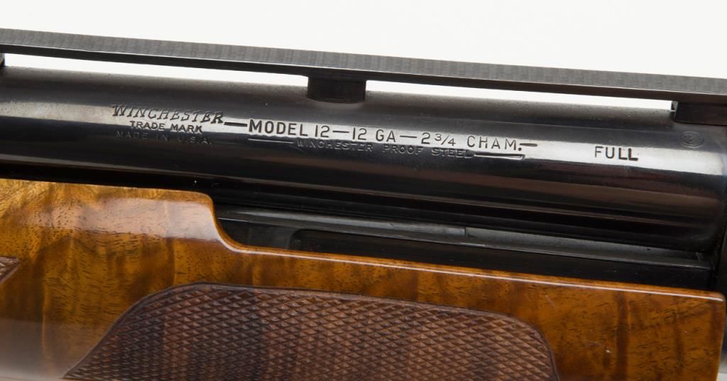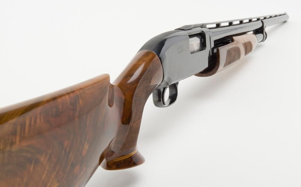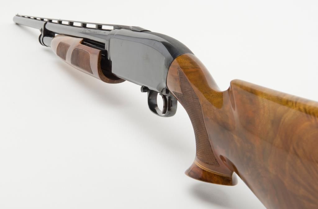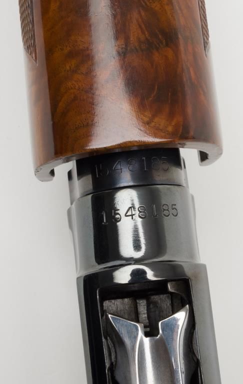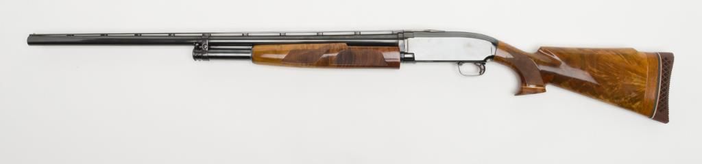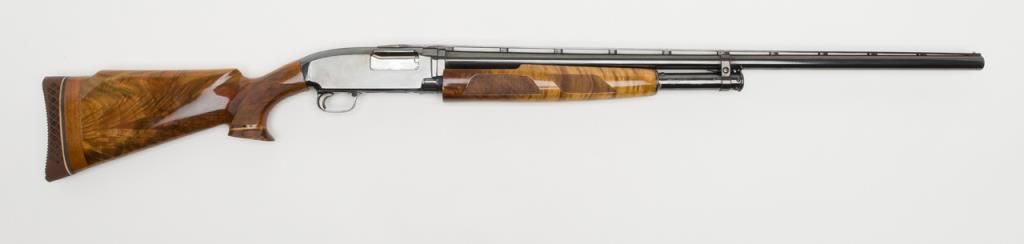 Customized Winchester Model 12 pump action takedown shotgun, 12 gauge, full choke, 30” ventilated rib barrel, re-blued finish, custom deluxe wood stocks with extended butt stock and hard rubber butt pad, #1548185 in overall verygood + condition as re-worked; beautiful wood, length of pull is 14-1/2” to end of butt pad, crisp action, bore should clean to very good. (C&R/PPT). Est.: $250-$500.