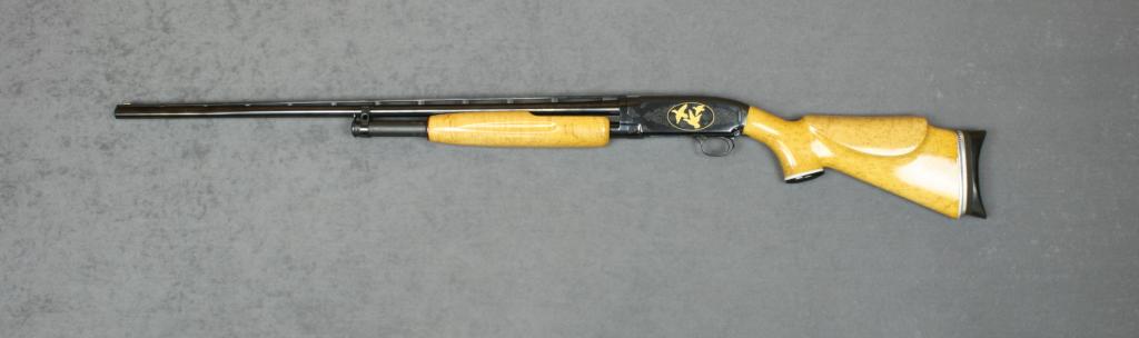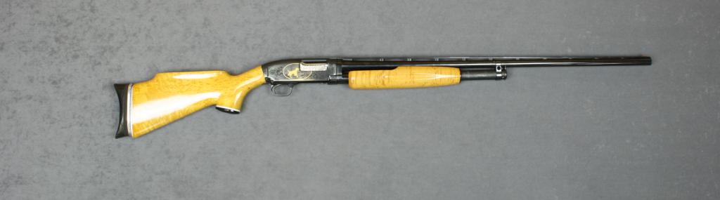 Customized Winchester Model 12 pump shotgun,  20 gauge, takedown frame, 30” custom  ventilated rib added to barrel by Simmons Gun  Specialties of Kansas City, MO., reblued  finish, fancy engraving and gold inlaid gamescenes on both sides of receiver, custom  birdseye maple stocks with adjustable butt  plate, #921627. This gun is in overall fine  condition as customized showing approx. 98%  custom re-blue, finely engraved and beautiful gold inlays of a hunting dog on the right  side of the receiver and three birds in  flight on the left side of the receiver, bore  should clean to fine, crisp action,  beautiful custom stocks with butt stockshowing Monte Carlo cheek piece.  A  beautifully accomplished Winchester.  Est.:   $900-$1,800.