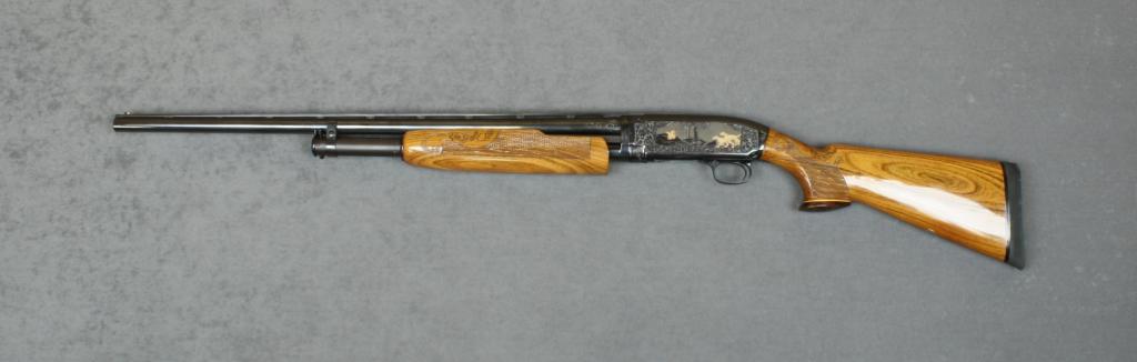 Customized Winchester Model 12 takedown pump action shotgun, 16 gauge, 26” ventilated rib barrel, engraved with gold inlaid game scenes on both side of the receiver by Neal Hartlep, custom checkered wood stocks,#42712. This gun is in overall fine condition as reconditioned and customized showing the majority of that re-blued finish, excellent quality engraving and inlays, fine bore, crisp action and fine stocks; accompanied byan extra barrel assembly with 26” ventilated rib barrel including muzzle choke, fine bore and fine carved and checkered wood fore end. Est.: $900-$1,800.