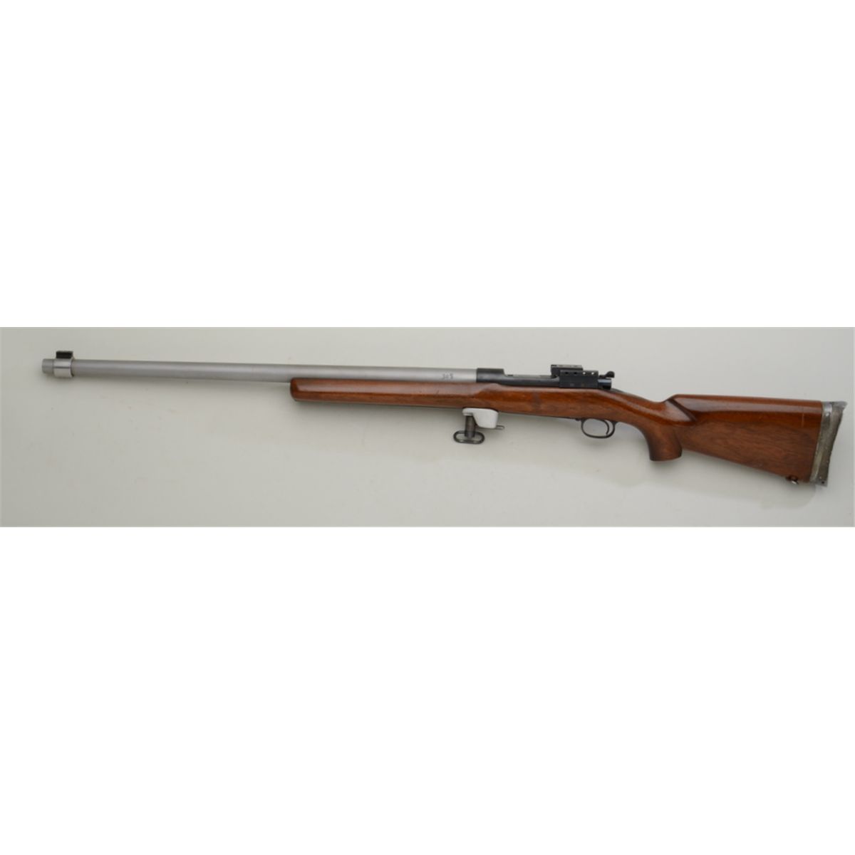 Customized Winchester Model 70 bolt-action target rifle, .308 cal., 26” heavy barrel, satin finished custom barrel, black finish to receiver, custom wood half stock with adjustable steel butt pad and front supportrail, #11293. This gun is in overall fine condition as customized with an excellent bore, crisp action, scope mounts, sling swivels, fine wood half stock with some scattered nicks and mars from carry andstorage. Est.: $500-$750.
