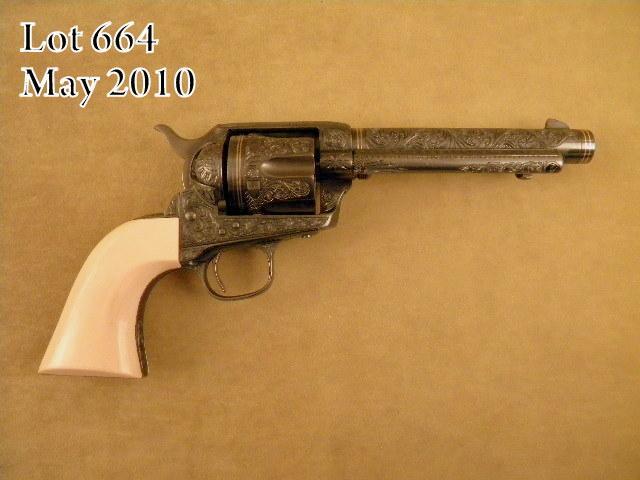 Customized and engraved First Generation black powder Colt SAA revolver, .32 WCF cal., 5-1/2” barrel, re-blued finish, silver banded barrel and cylinder, smooth ivory grips, #112211. This gun is in overall very good condition as customized andextensively engraved with engraver initials on the trigger guard “BJ” (probably Bob James); majority of re-blue remains, bore is good, crisp action, sharp markings, excellent ivory grips. This gun is accompanied by a custom wood Colt display box,French fitted interior and lined. A very tastefully accomplished customization of an antique Colt SAA revolver. Est.: $3,500-$5,500.