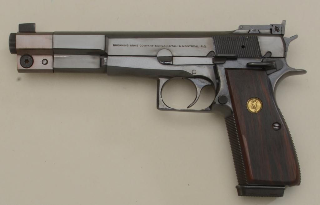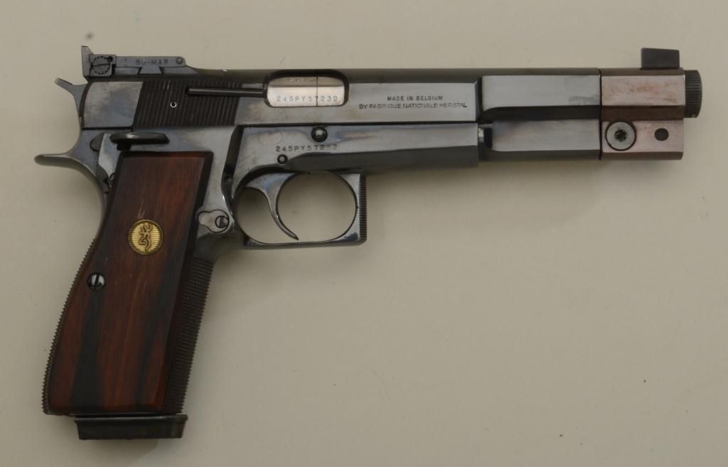 Customized and upgraded Belgian-made FN Browning semi-auto pistol, 9mm cal., 6” barrel including a custom extension and Bo-Mar adjustable rear sight, re- blued finish, wood medallion grips, stippled gripstraps, one extra magazine, custom slide release and safety, #245PY57232. This gun is in overall very good condition as reworked; fine bore, beautiful action, fine grips. Someone put a lot of time and effort into the upgrade of this pistol. Est.: $350-$700.