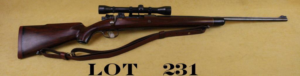 Customized bolt-action Mauser rifle, .270 Win. cal., 24” barrel with matted rib marked “Made in Austria”, blue finish, engraved game scene on top of receiver, bright bolt, custom wood stock with monte carlo cheekpiece, red hard rubber butt pad and leather sling. This gun is in overall very good condition showing the majority of its custom finish, very good bore, crisp action, tasteful engraving on the receiver, overallvery good wood stock; mounted with an unmarked scope with good optics. Est.: $600-$1,200.
