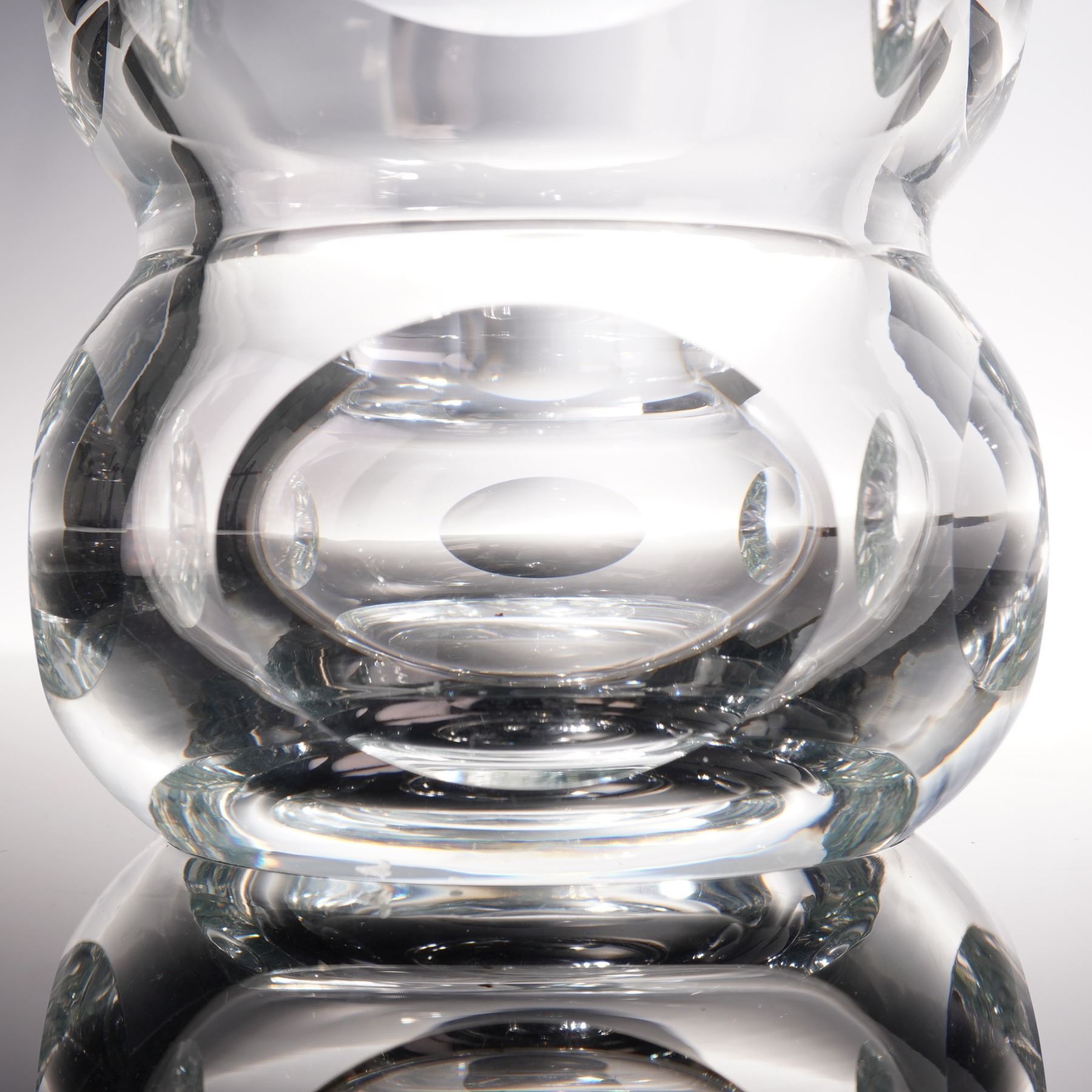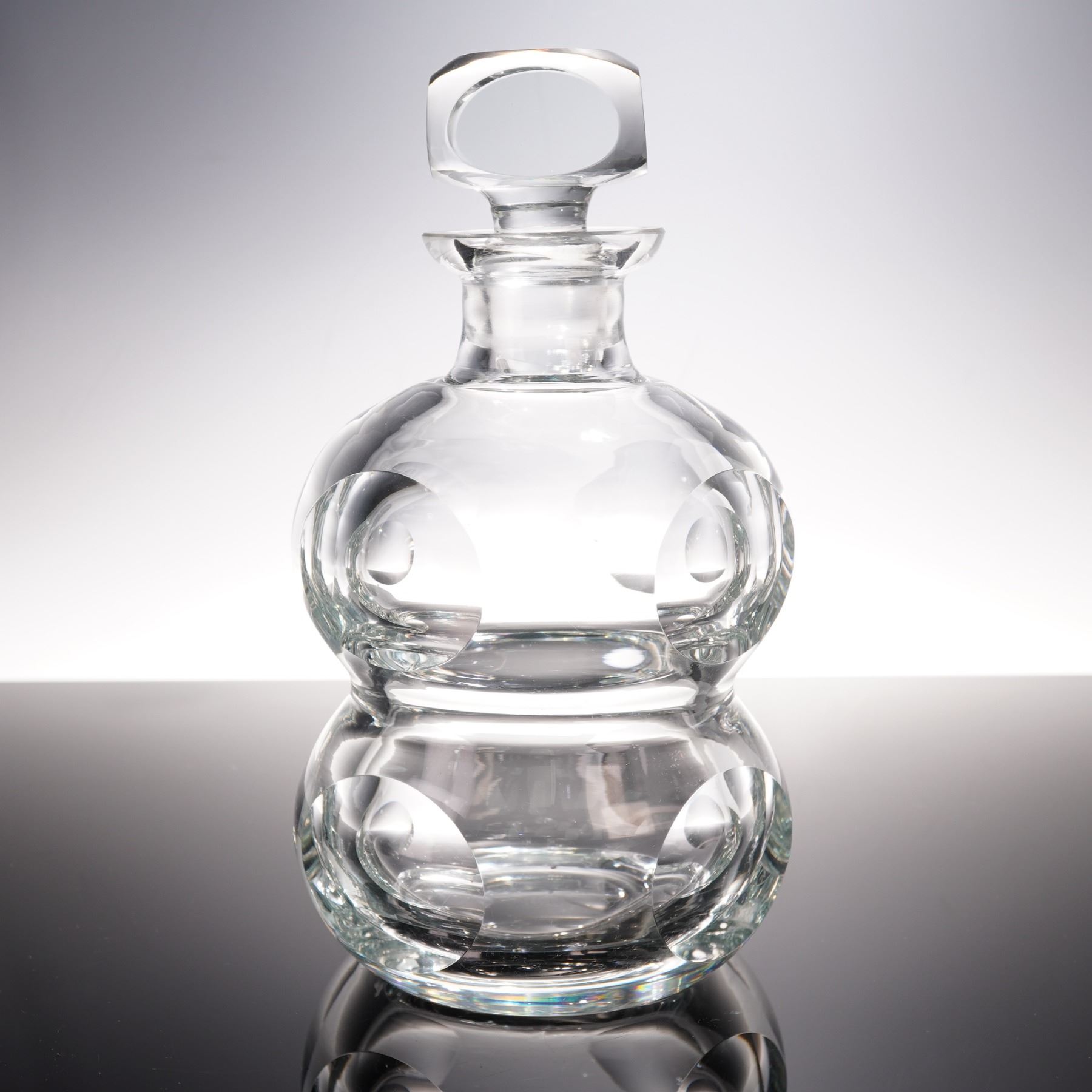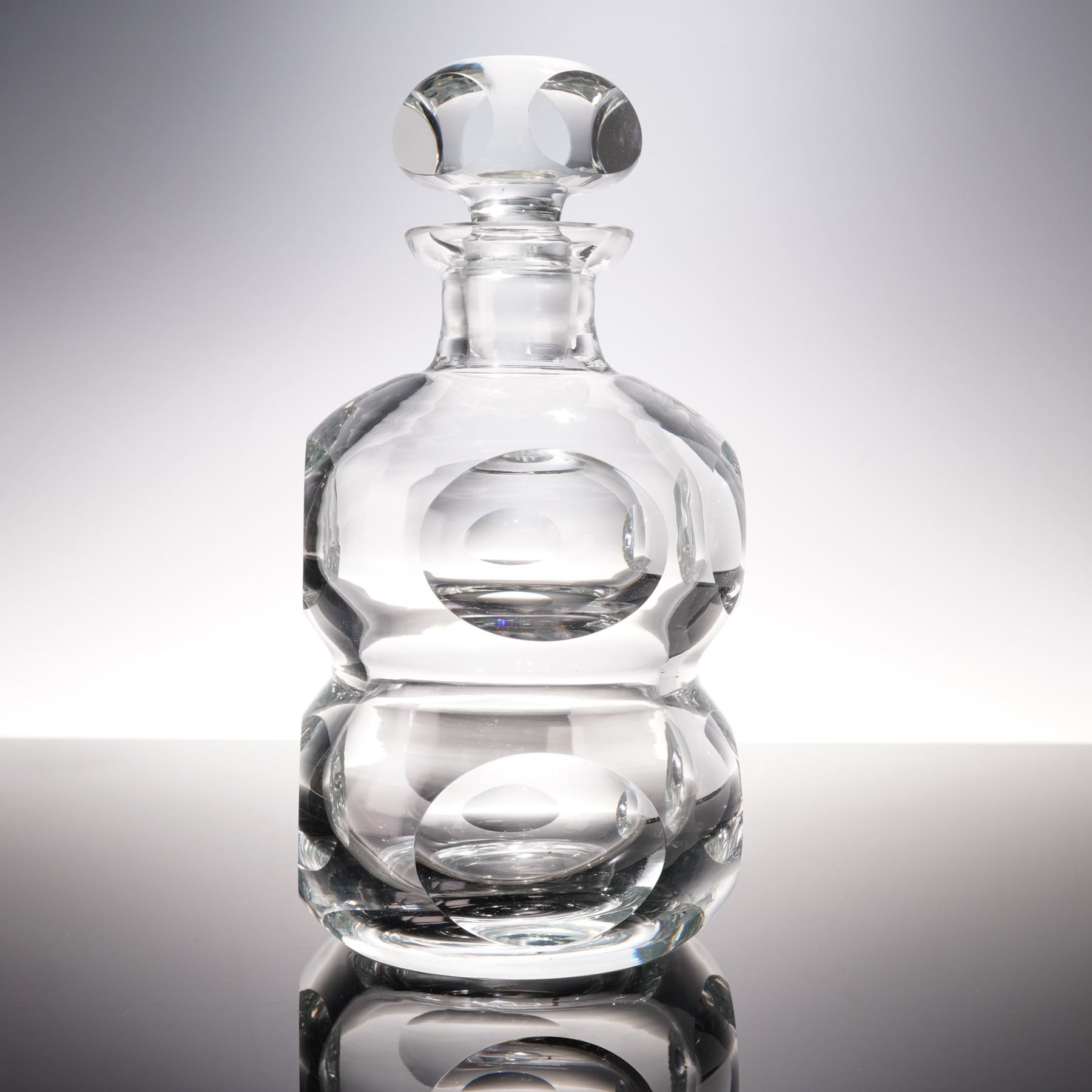 Clear glass decanter with rounded form featuring large cut lens motifs around the body and stopper. The heavy sculptural design emphasizes clarity and symmetry, characteristic of mid-century Scandinavian art glass craftsmanship. The decanter includes a matching spherical stopper with circular cut detailing.