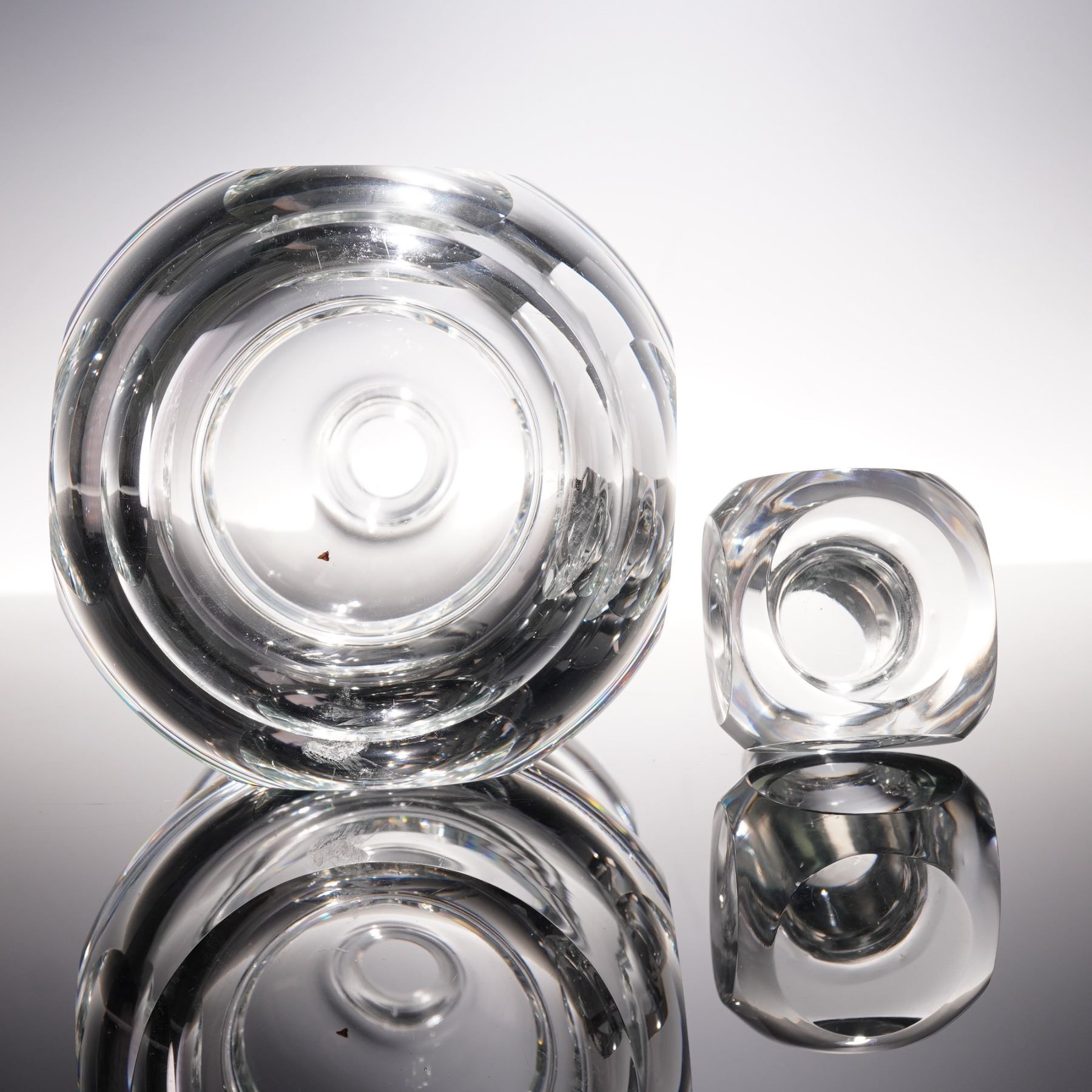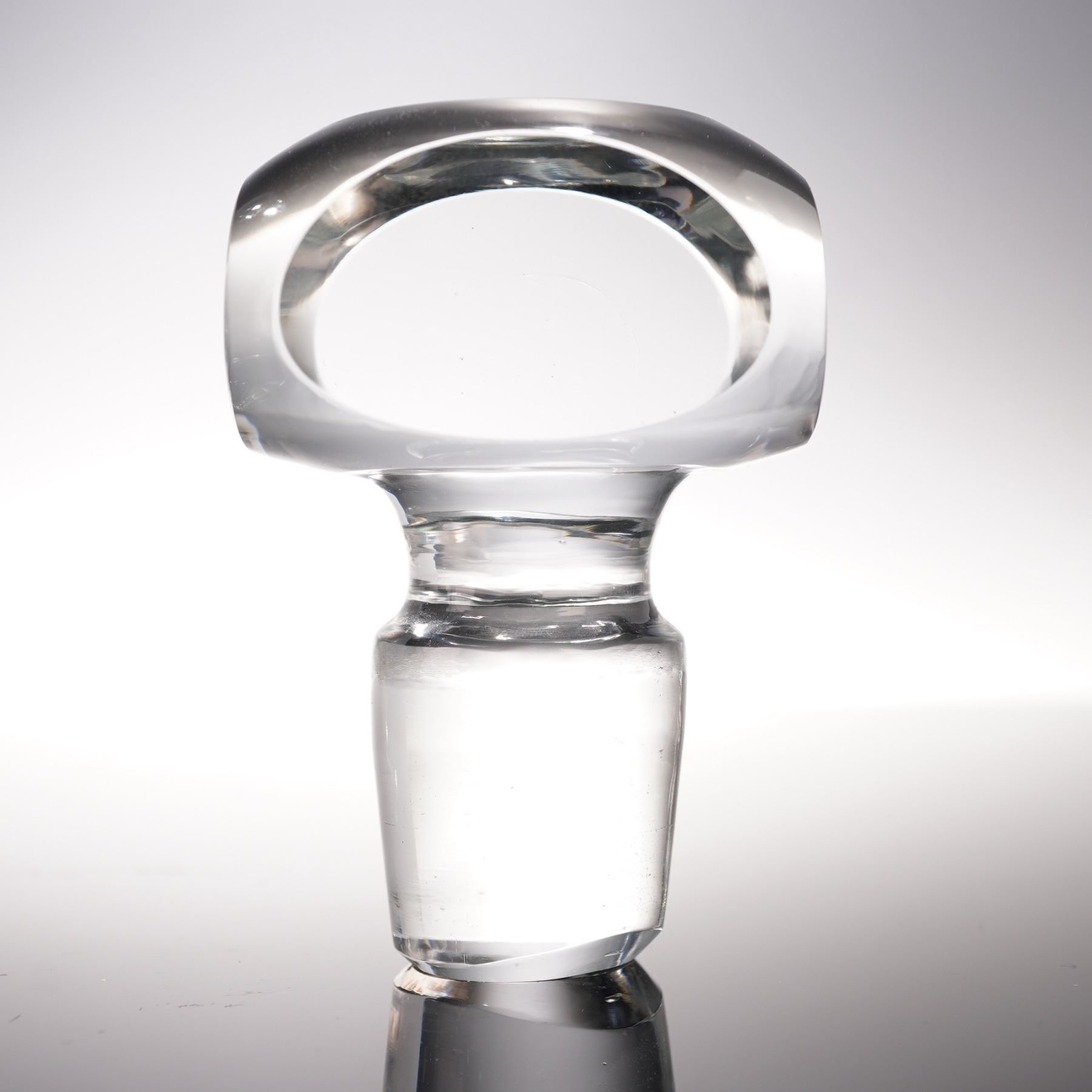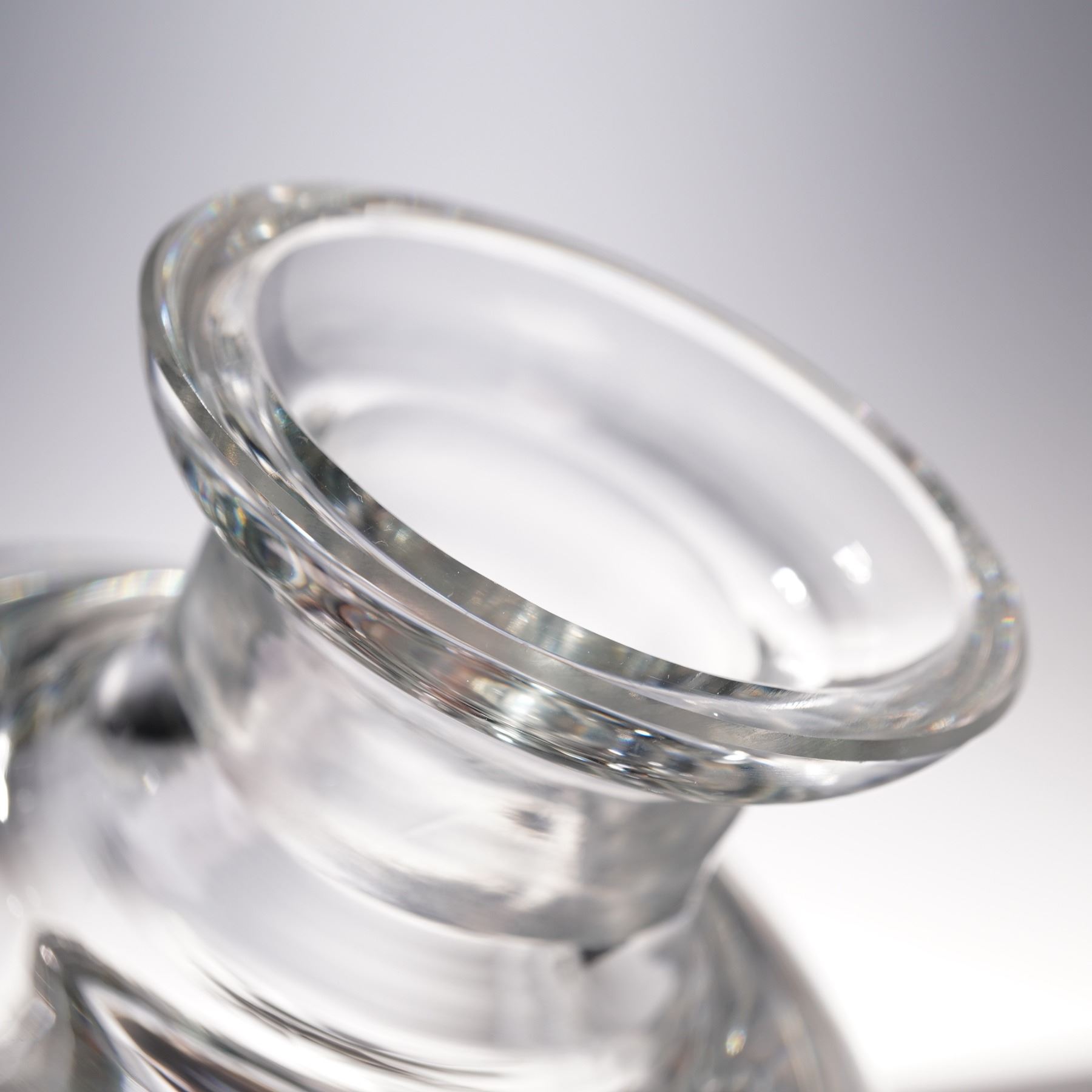 Clear glass decanter with rounded form featuring large cut lens motifs around the body and stopper. The heavy sculptural design emphasizes clarity and symmetry, characteristic of mid-century Scandinavian art glass craftsmanship. The decanter includes a matching spherical stopper with circular cut detailing.