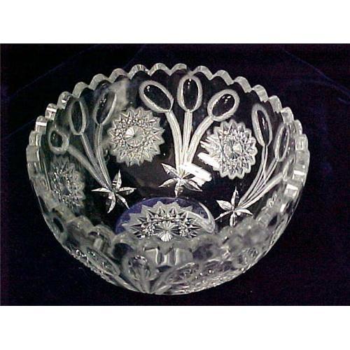 Gorgeous Cut Crystal Bowl. The bowl has a sunburst and pussy willow pattern cut into the sides, and it has a sawtooth rim. It measures 4 ?h x 8?d, and is in good condition with the exception of a couple of chips and some flea bites on the inside of the rim.