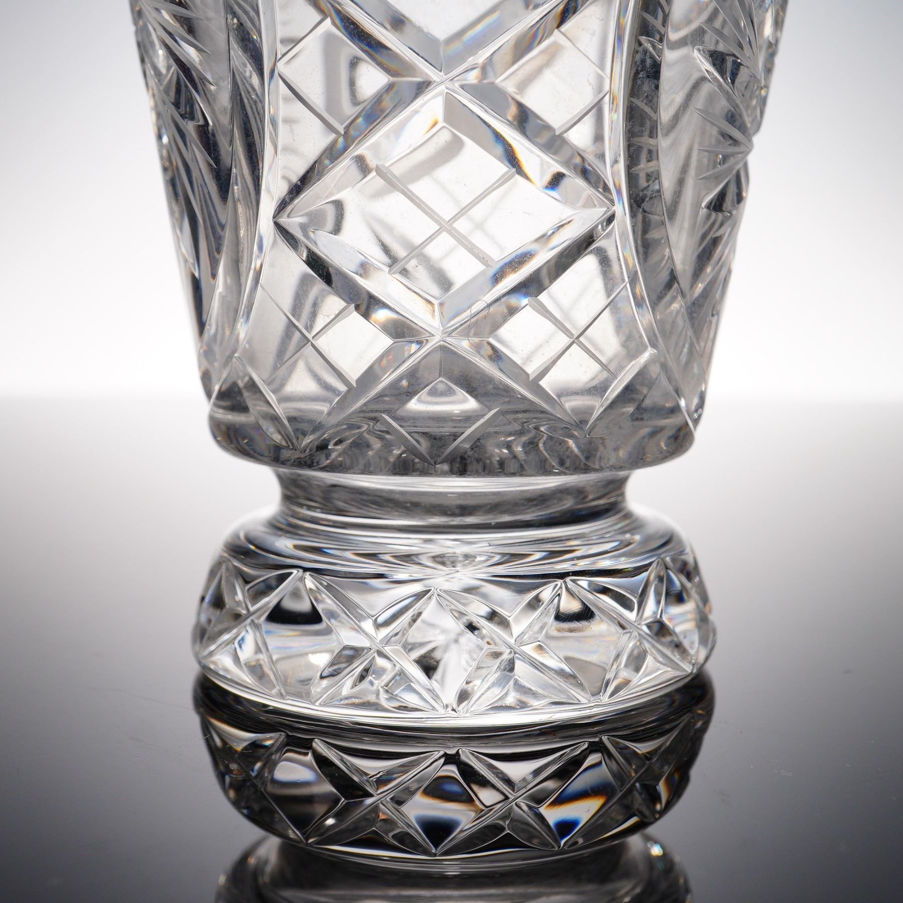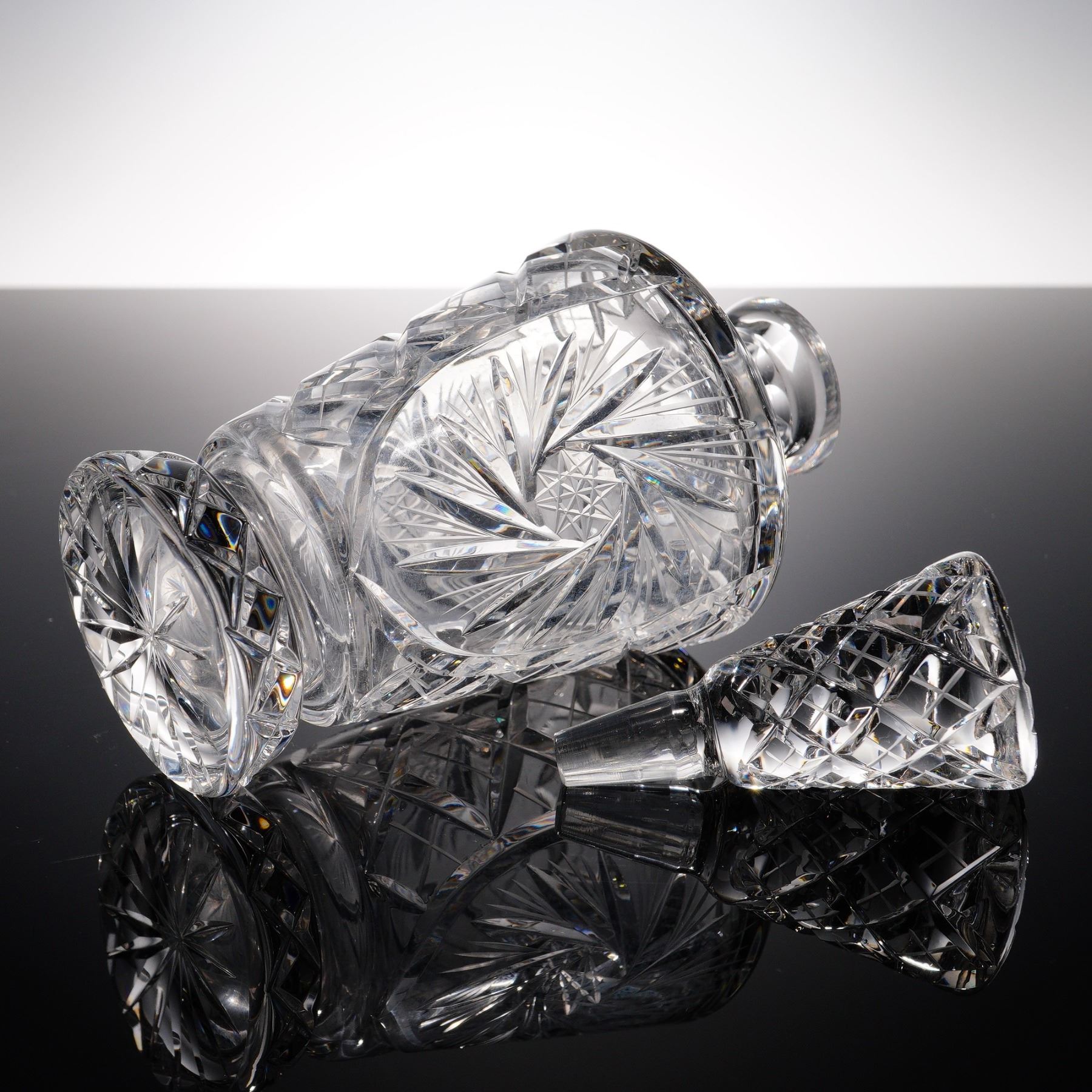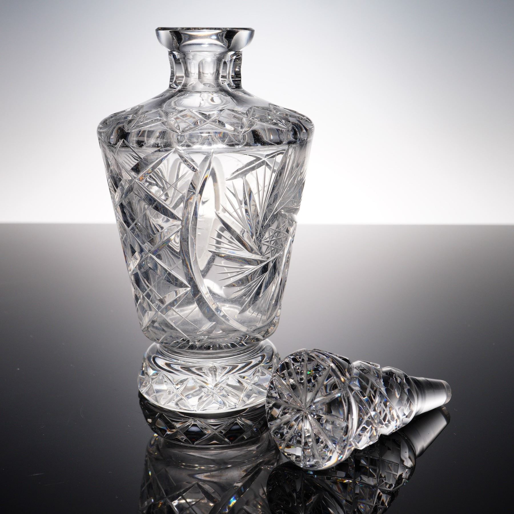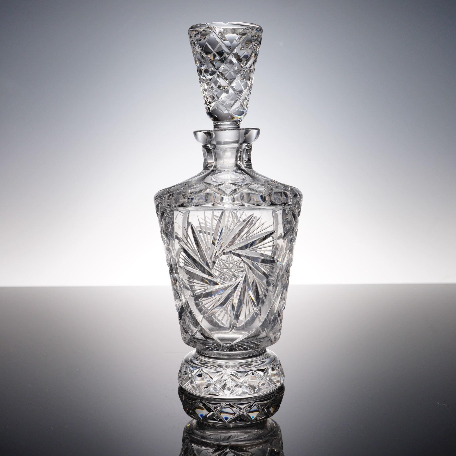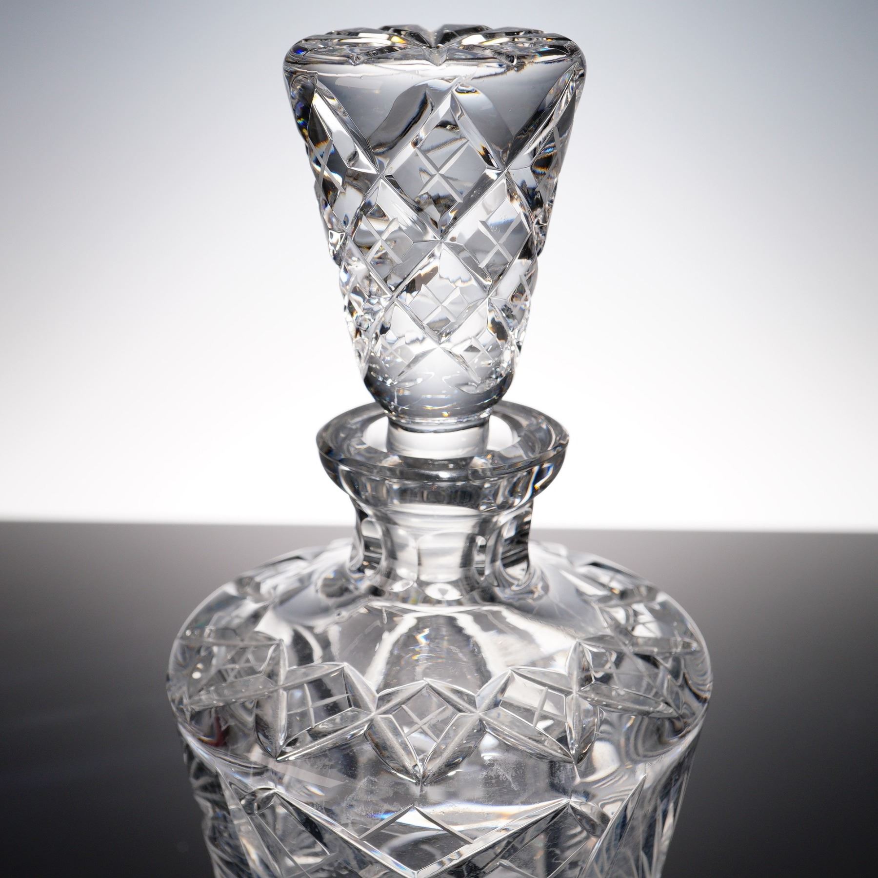 A finely crafted clear cut crystal decanter featuring a prominent starburst motif to each face and diamond crosshatch banding around the base and neck. The faceted stopper is deeply cut to match the geometric clarity of the body. Likely American Brilliant Period, late 19th to early 20th century. Stopper and base both display crisp, brilliant refraction. In excellent condition with no chips or cloudiness.