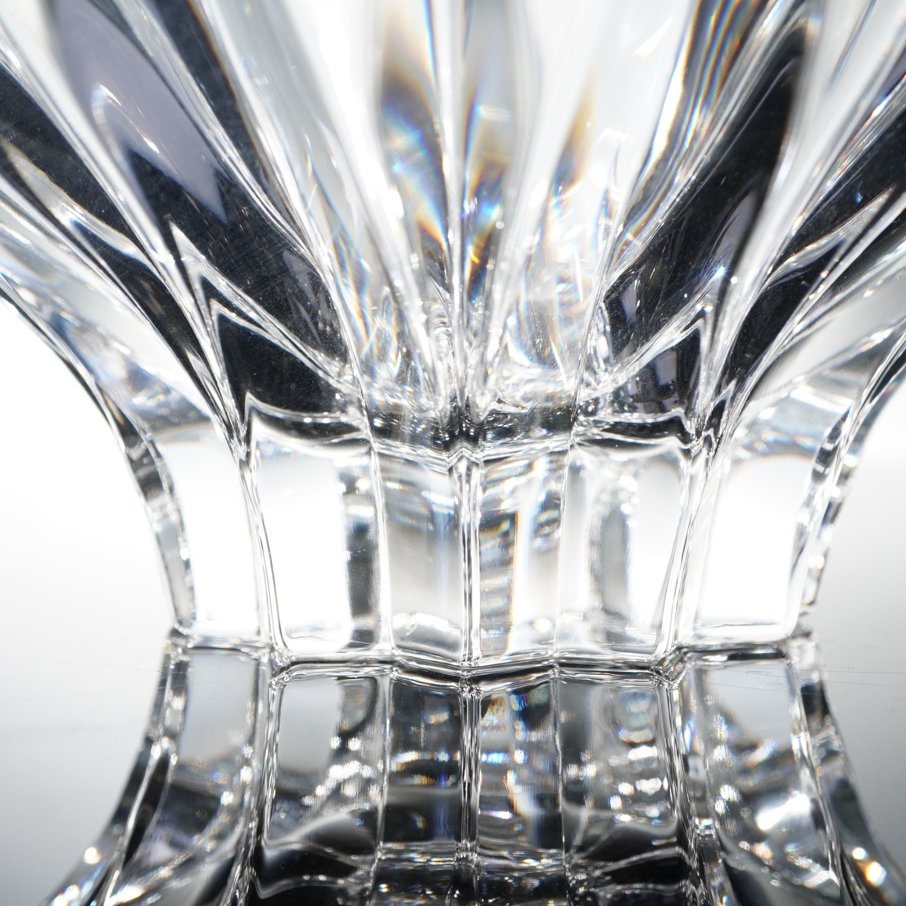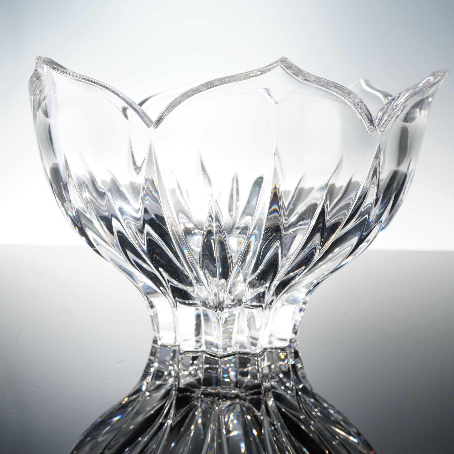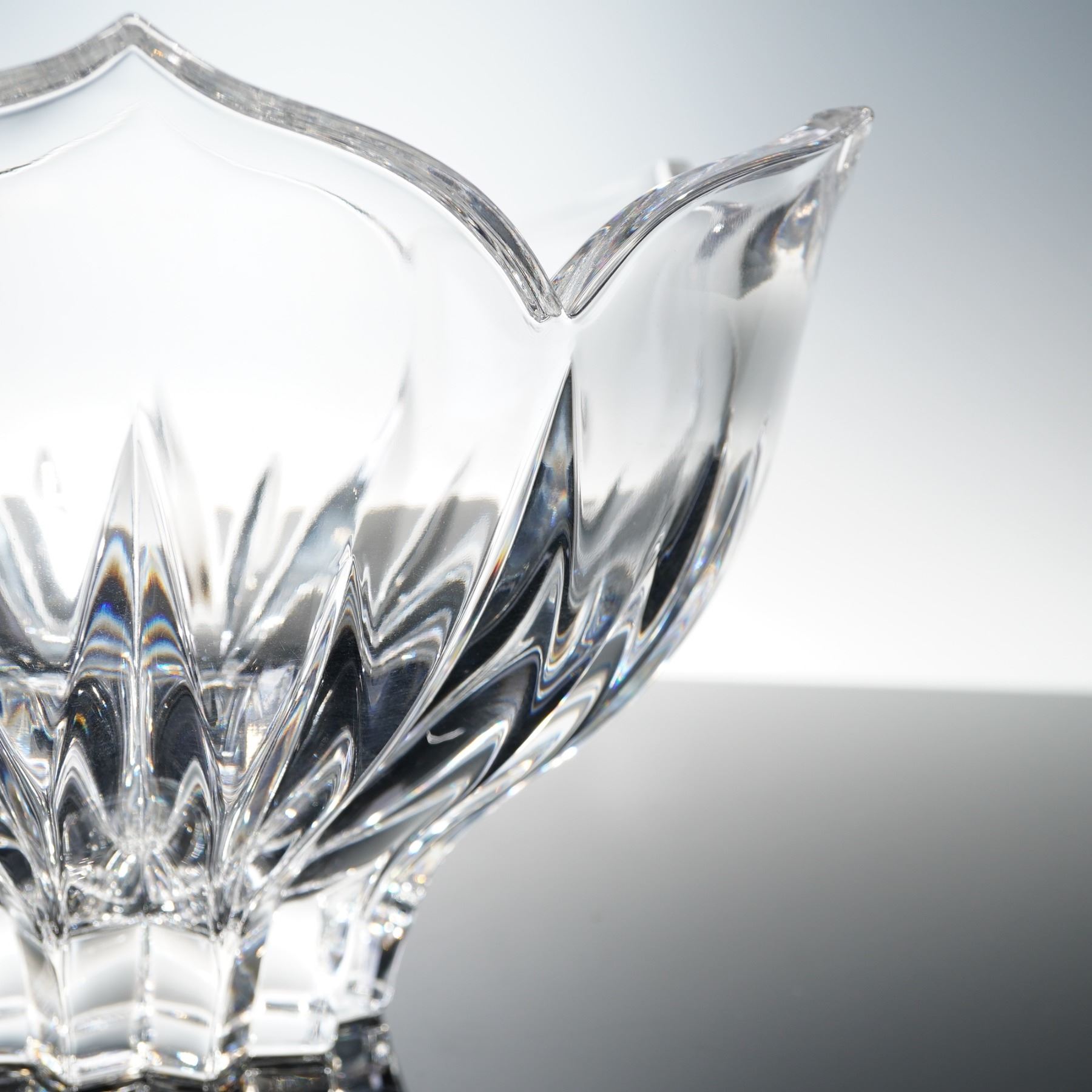 Featuring a sculpted petal-form rim and faceted lower body, this clear cut crystal bowl displays a flowing vertical design that catches and reflects light with clarity. The piece rests on a thick, faceted base and showcases precise craftsmanship and balanced proportions.