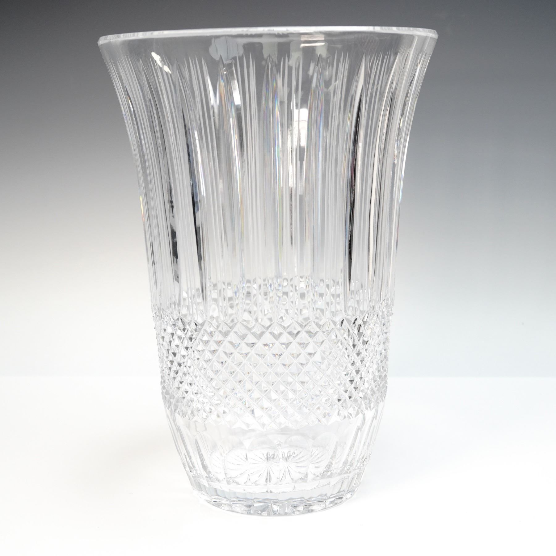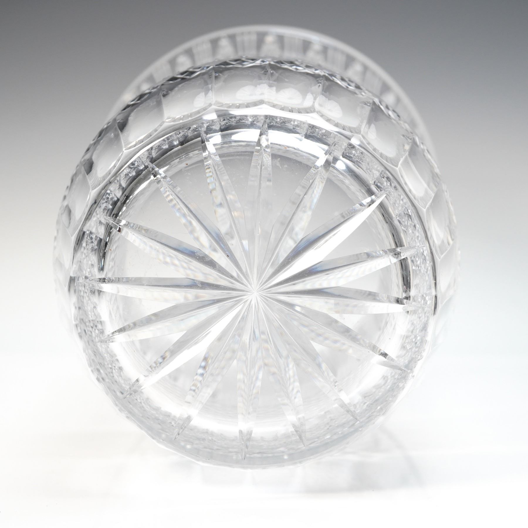 Elegant cut crystal vase featuring a flared rim, vertical panel cuts, and a deeply faceted diamond pattern around the lower body. The base is finished with a finely executed starburst design, showcasing classic craftsmanship and clarity. Perfect as a display piece or centerpiece for floral arrangements.