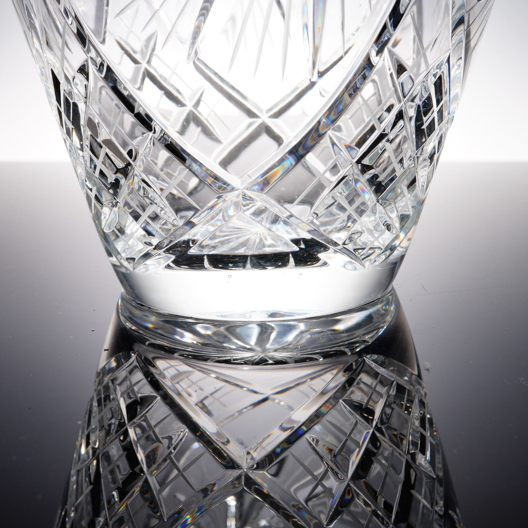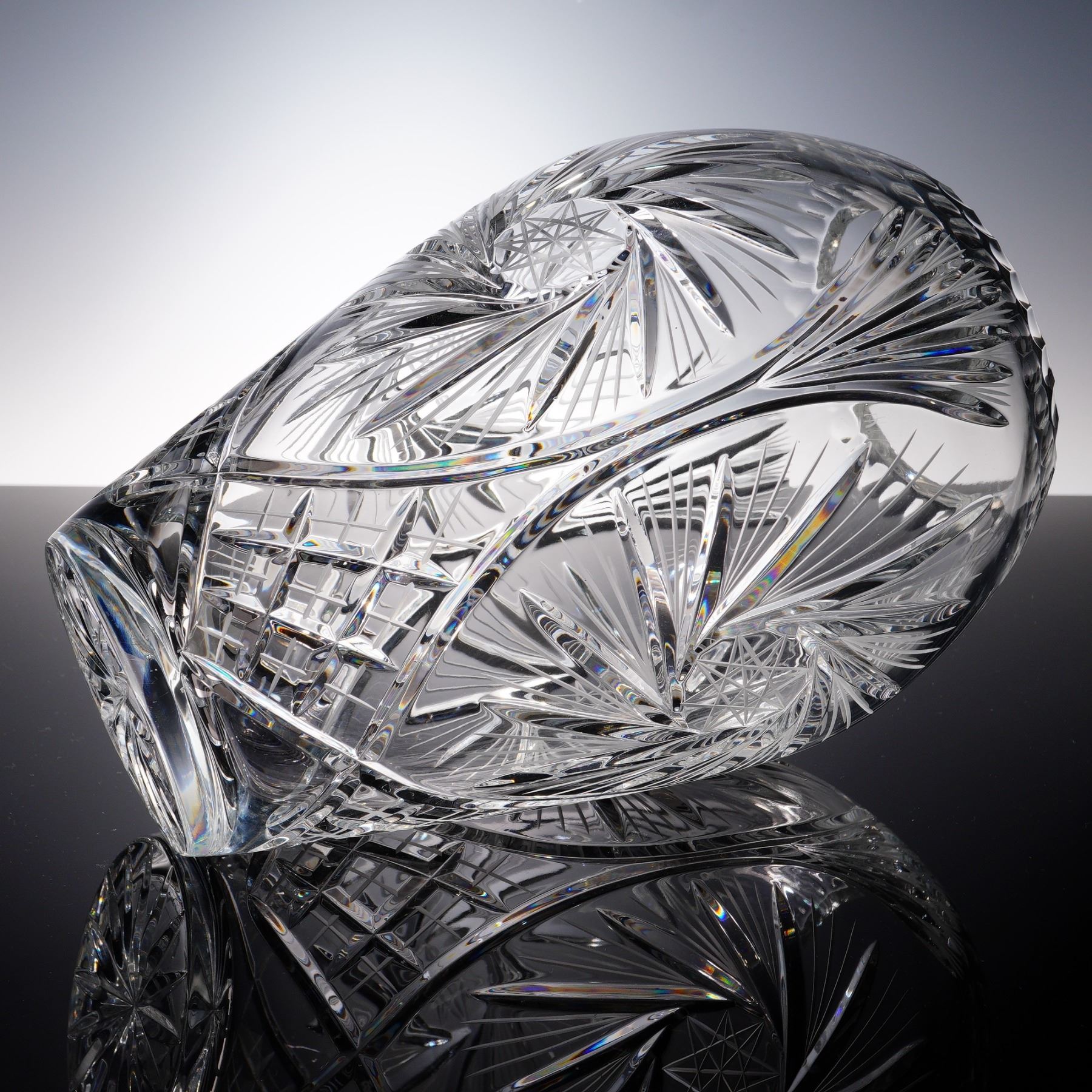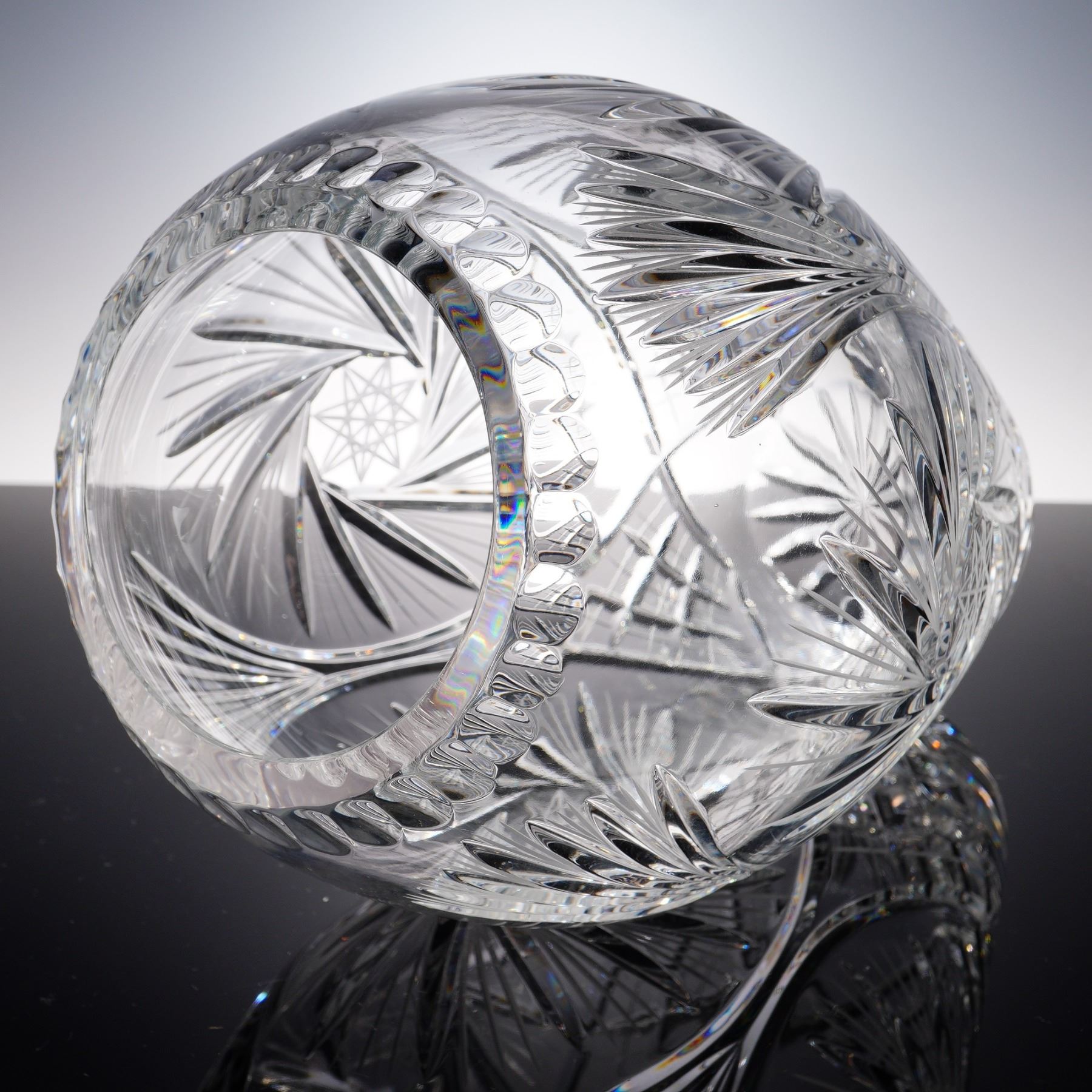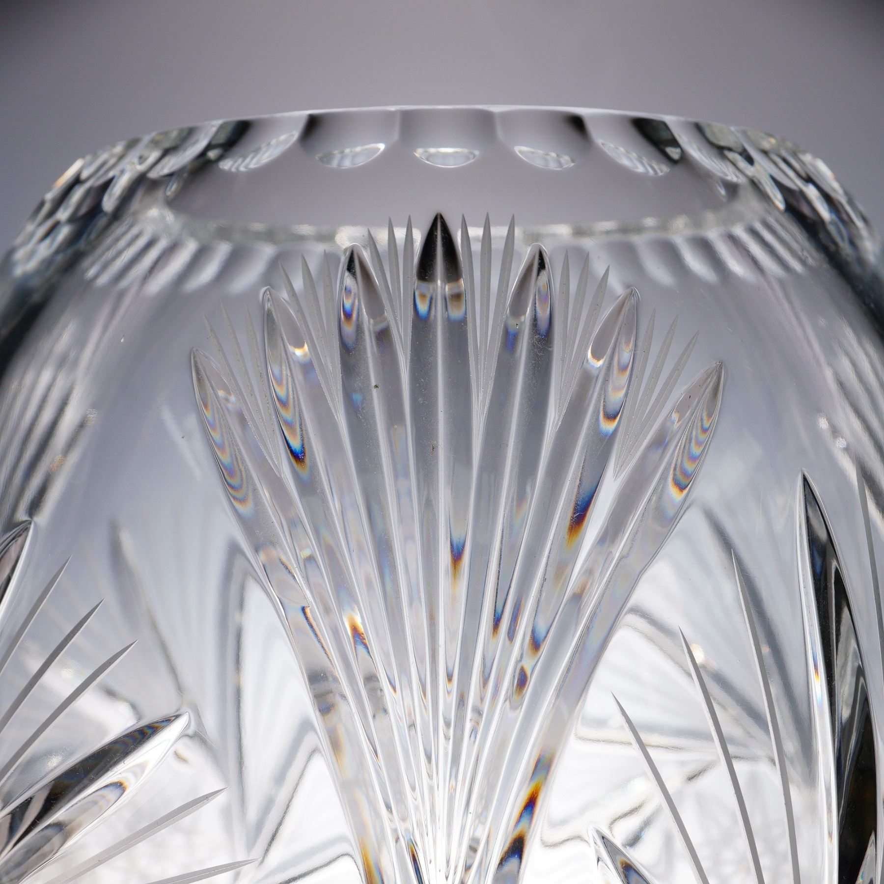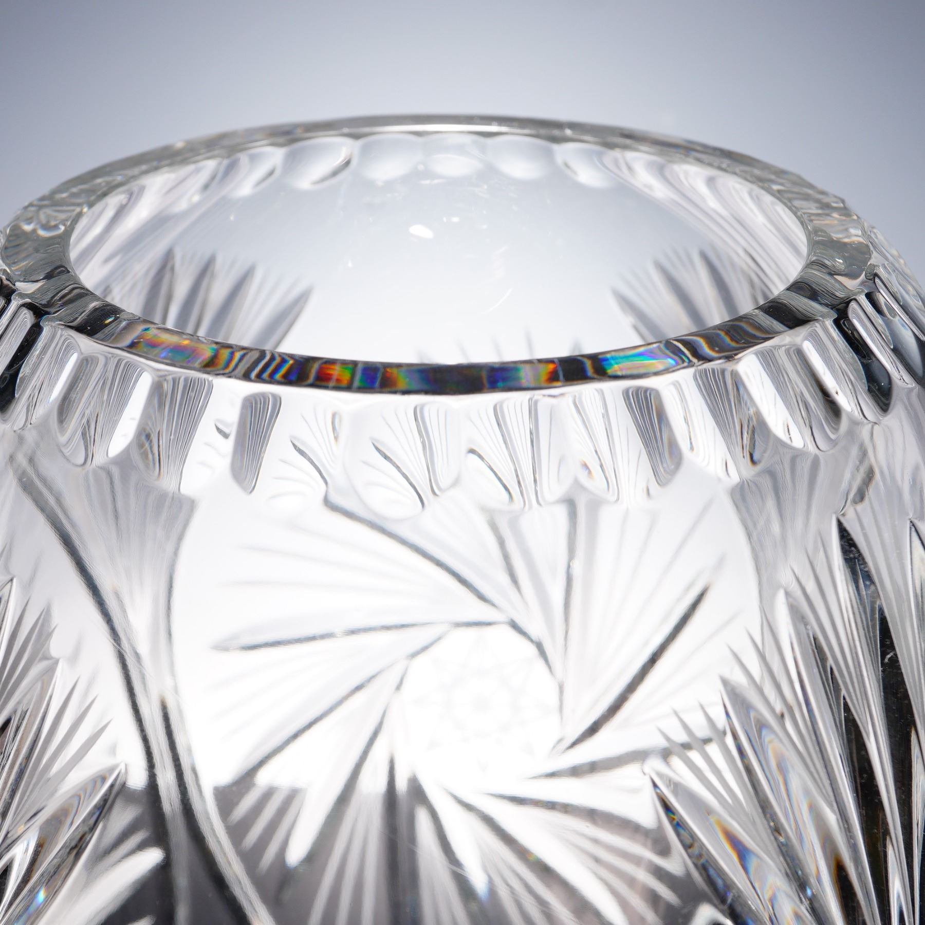 Rounded clear crystal vase with deeply cut swirling fan design radiating across the body in a starburst pinwheel pattern. Accented with crosshatched panels and vertical cuts, with scalloped rim detailing. Strong clarity and brilliance, with excellent refraction throughout.