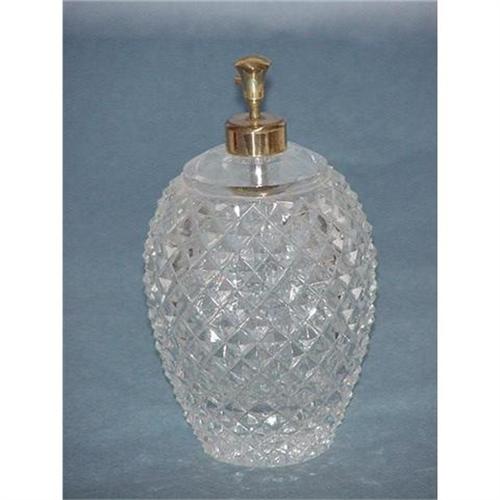 A beautiful cut glass atomizer, 6 1/4" tall, 3 1/4" in diameter. The atomizer is missing the glass straw that extends down the center of the bottle and screws to the pump to extract the perfume. If you can find a glass or even a plastic tube that will fit onto the threaded end of the pump you wil have a great atomizer. Sold as is, otherwise the condition is beautiful, no chips on any of the points, the bottom is polished flat, it's a beautiful bottle. (1+)