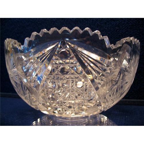 Heavy, thick bowl with great cut pattern of flowers and leaves. The teeth do have some small chips and flea bites when examined with a large magnifying glass. Terrific shine with no scratches inside or out.