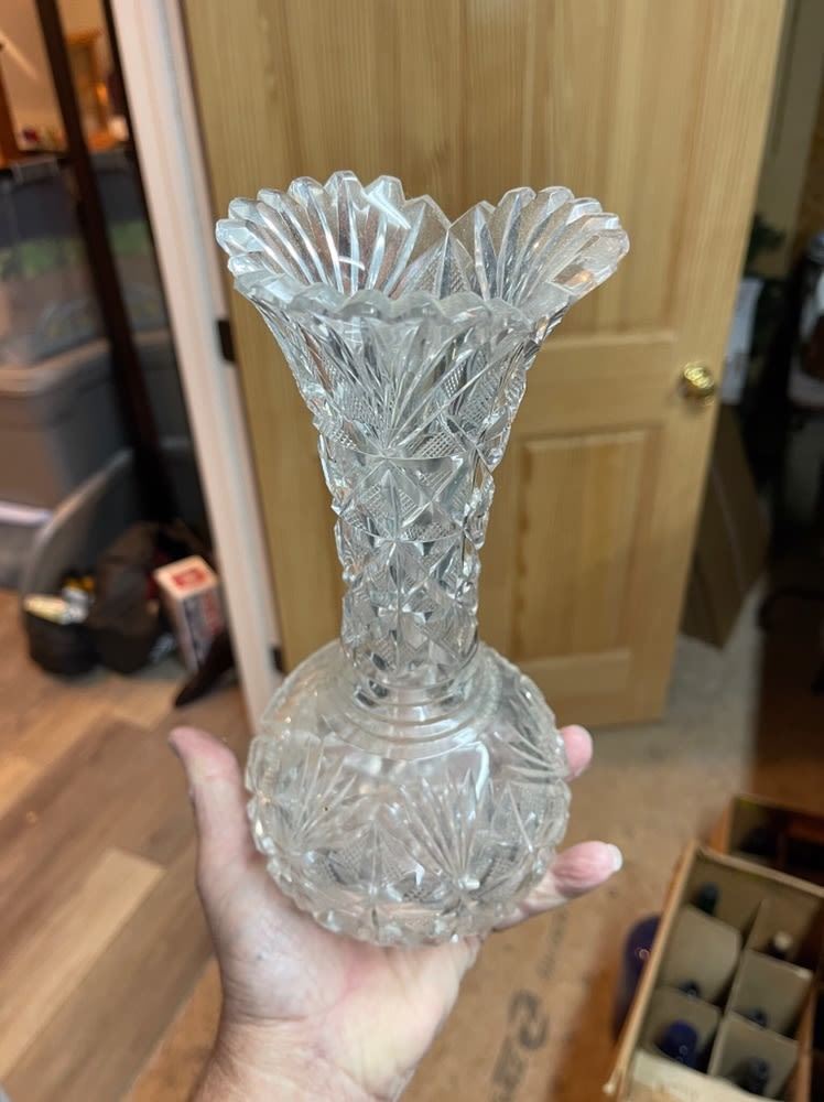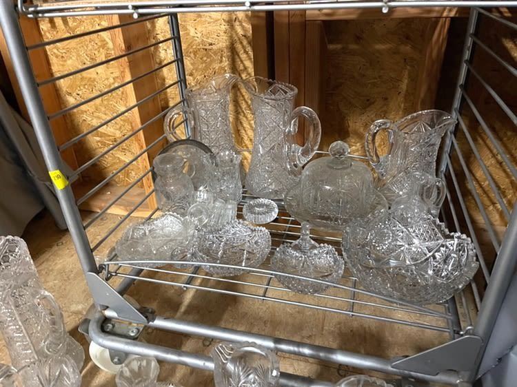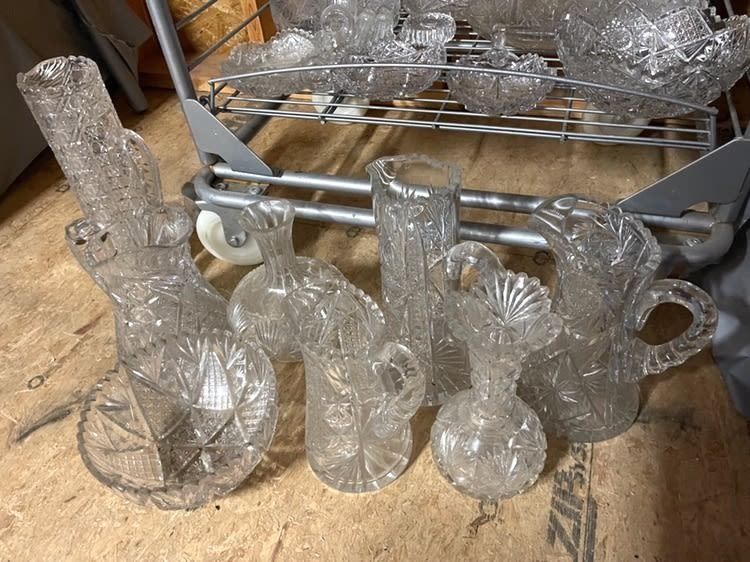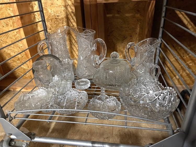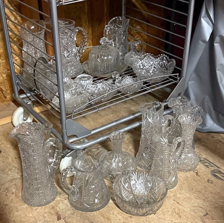 24 pieces of cut glass including American Brilliant, pitchers, nice vase, bowls, covered dish, etc. Beautiful collection from the attic collection!