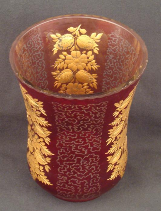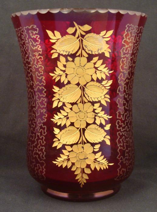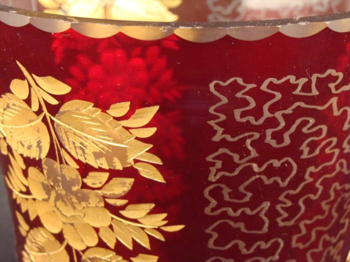 This ruby vase has cut glass and gilt floral designs, and gilt patterns. It measures 8" tall, and 6" in diameter. There is some gilt wear, and light nicks around the rim, but otherwise this vase is in very good condition.