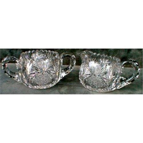 Very pretty American Brilliant cut glass creamer and open sugar bowl cut with strawberries. The mouths or tops are dentilated and there are notches on the handle. Star bursts on bottoms. The cutting is deep and sharp.