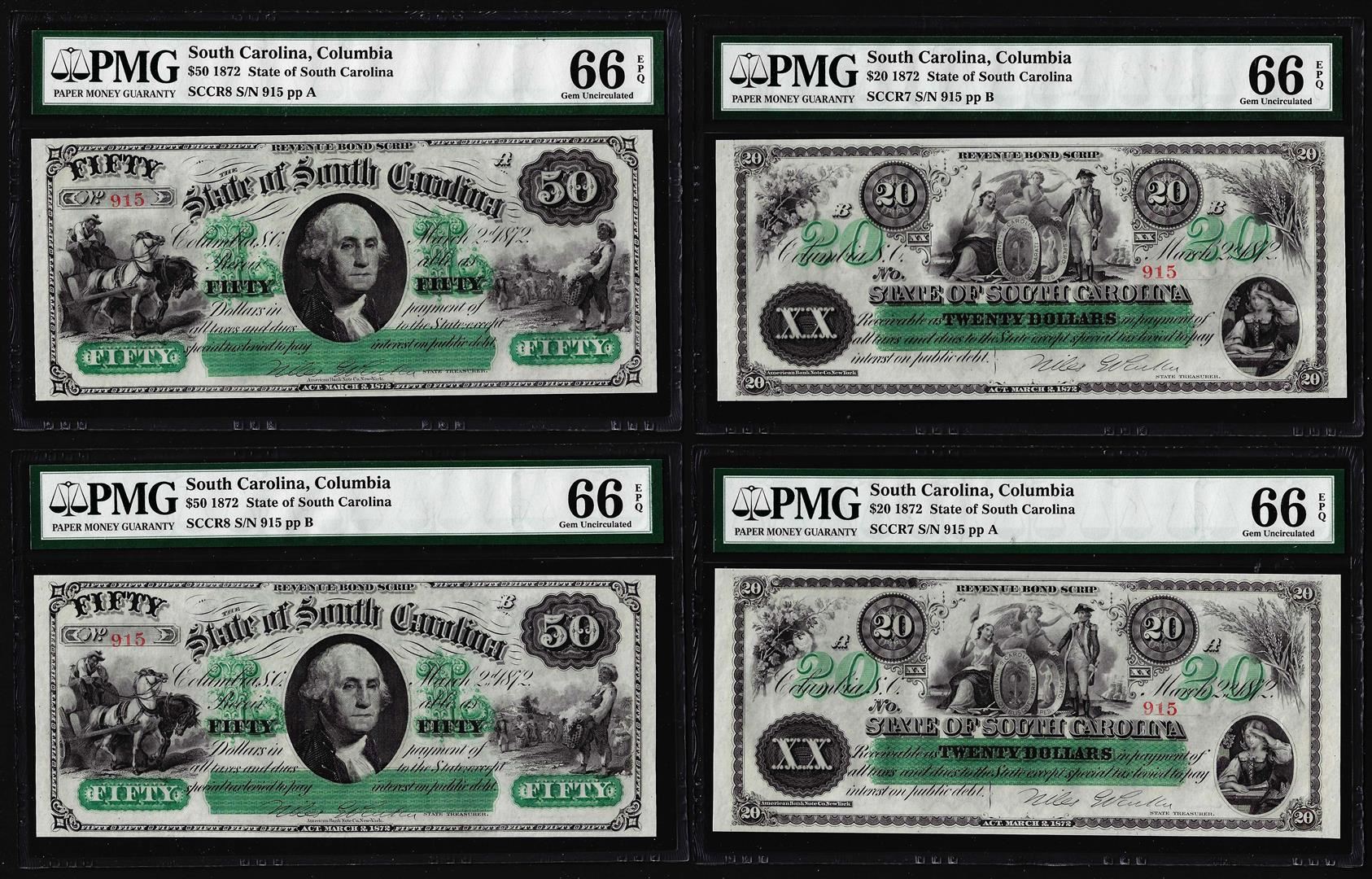 One Cut Sheet of 1872 $20 & $50 State of South Carolina Obsolete Notes PMG Gem Uncirculated 66EPQ. PMG Certified.