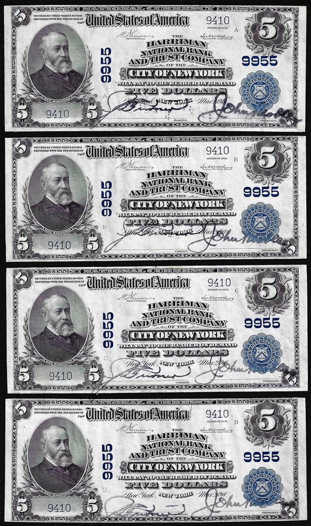 One Cut Sheet of (4) 1902 $5 Harriman NB New York, NY CH# 9955 National Currency Notes.