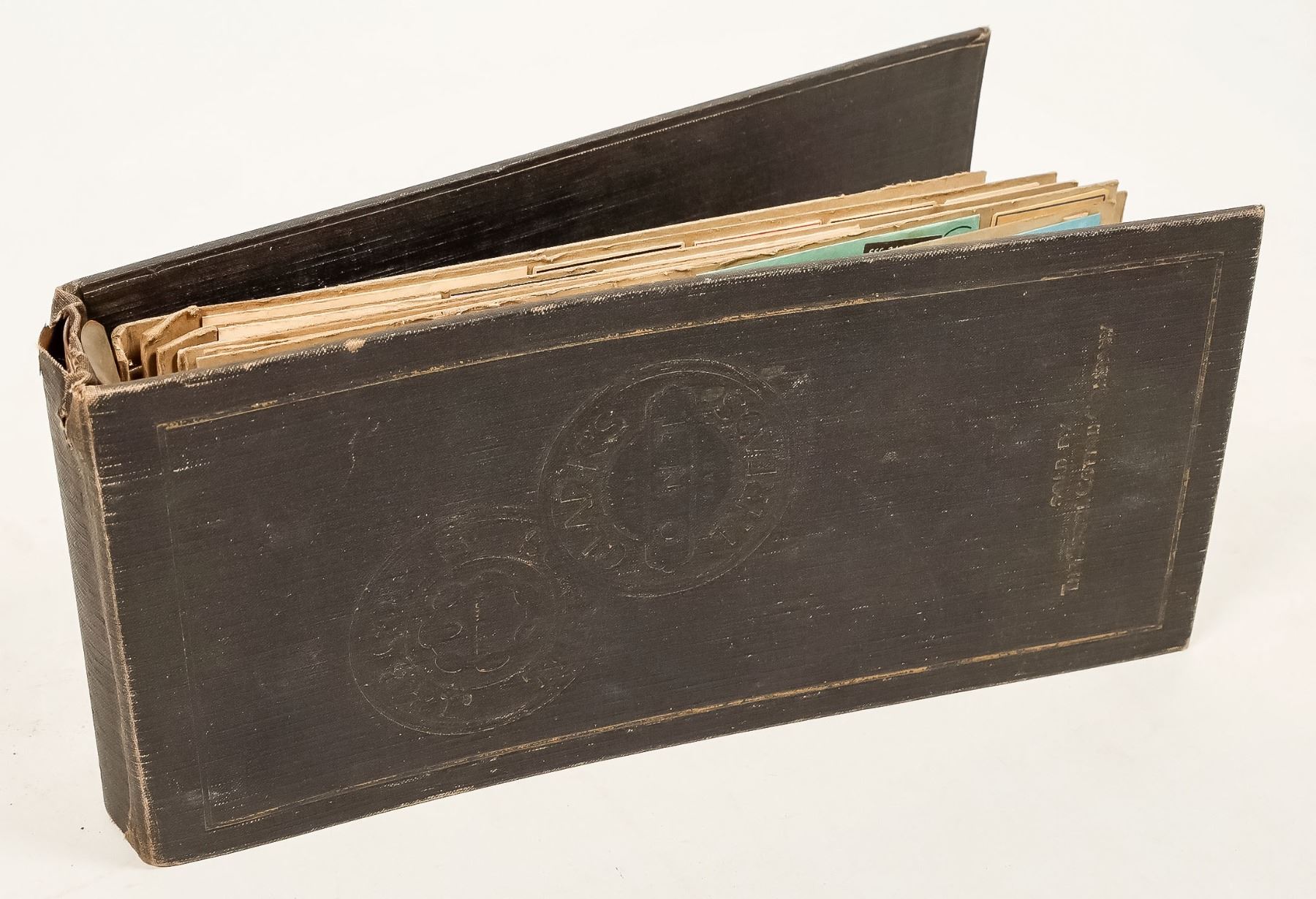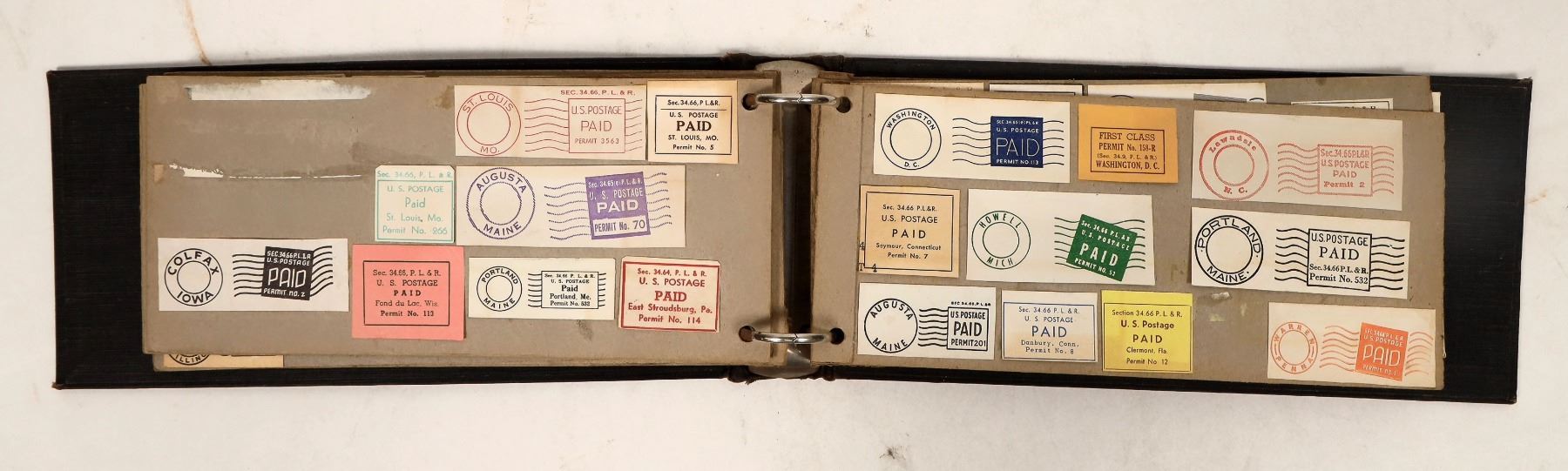 An album containing approximately 260 pieces of cut square postage mounted on cardstock pages and an additional group of cut squares in an envelope. Squares date from the mid-1900s. They originate from a variety of cities around the United States; all squares list location and permit number. Album has some wear on spine but is in relatively good condition.