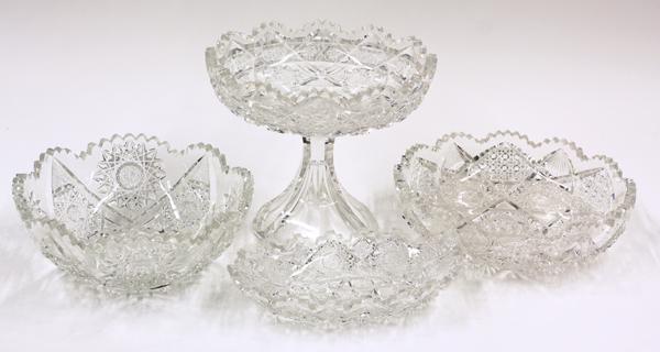 (Lot of 4) cut crystal group, each having a faceted an geometric body, consisting of a footed compote 7''h, Clark low bowl 2.5''h x 9''w, Clark bowl 3''h x 8''w, and an oval low bowl