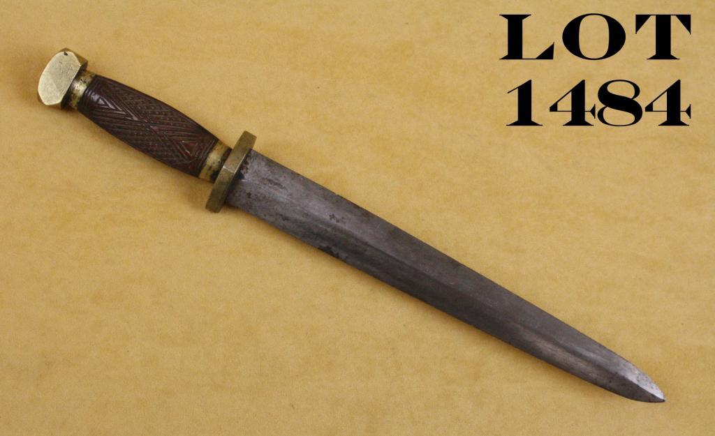 Cut down Chinese sword to knife size, approx. 14” overall with an approx. 9-1/2” blade, simple brass guard and brass pommel, checkered hard wood grip. This older piece is in overall good condition as modified andthe type of weapon used in early San Francisco by the Tongs. Est.: $150-$300.