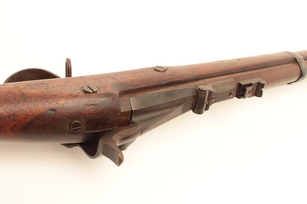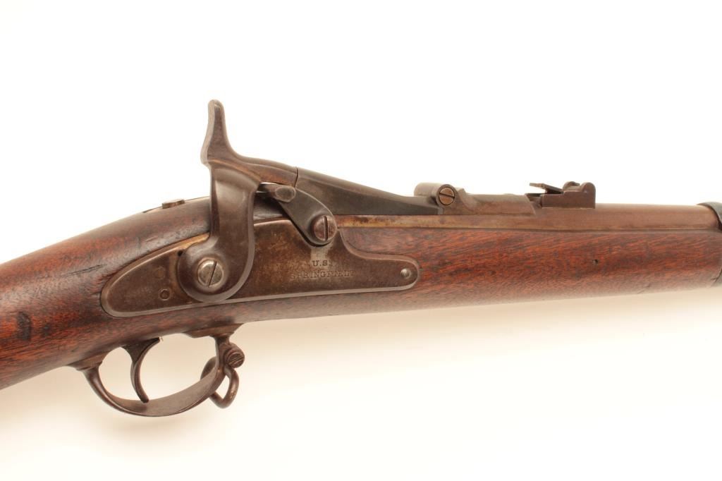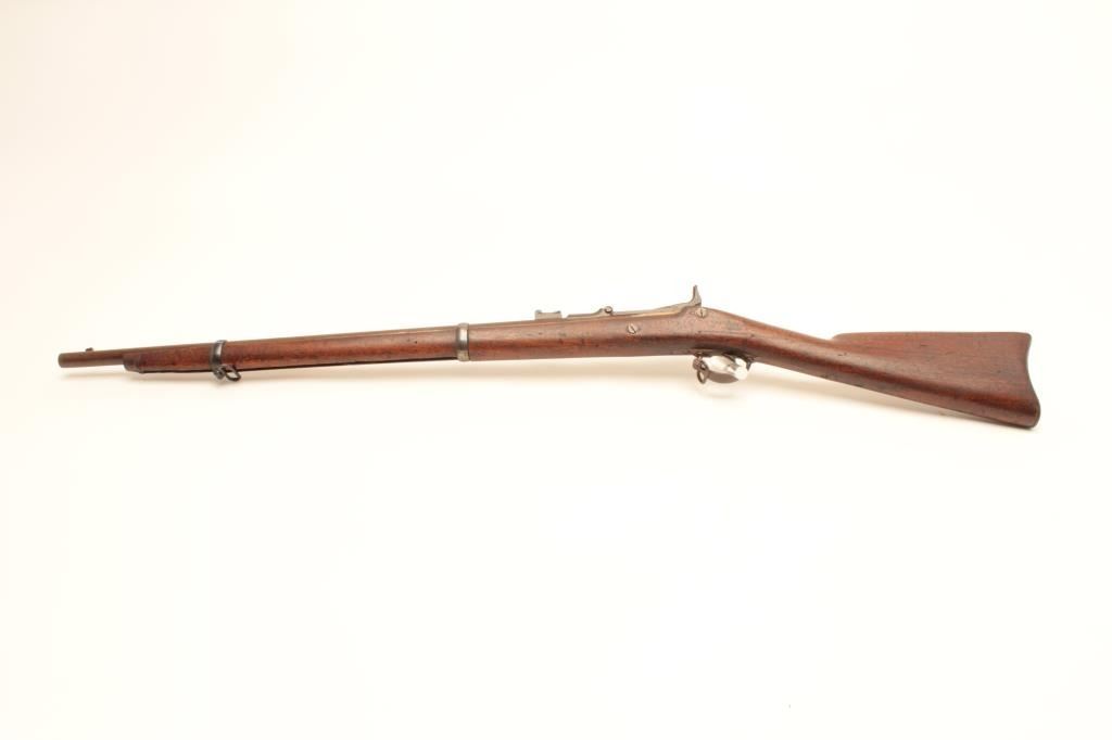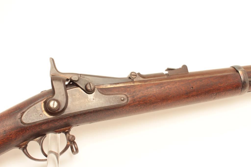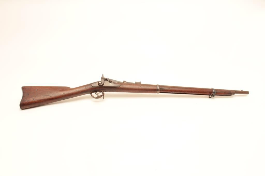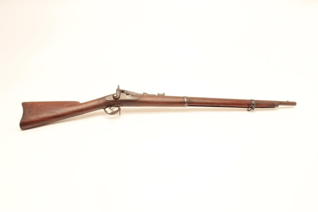 Cut-down U.S. Springfield Allin conversion rifle, .50 caliber, 27” barrel, wood stock, no visible S/N, in overall good condition with a dark patina to metal surfaces, crisp action and markings, good wood with scattered old mars and dings from carry and storage; missing ramrod. (Antique). Est.: $250-$500.