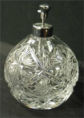Cut glass atomizer with wheel cut designs stands 5" tall. No cracks, small chip to underside rim