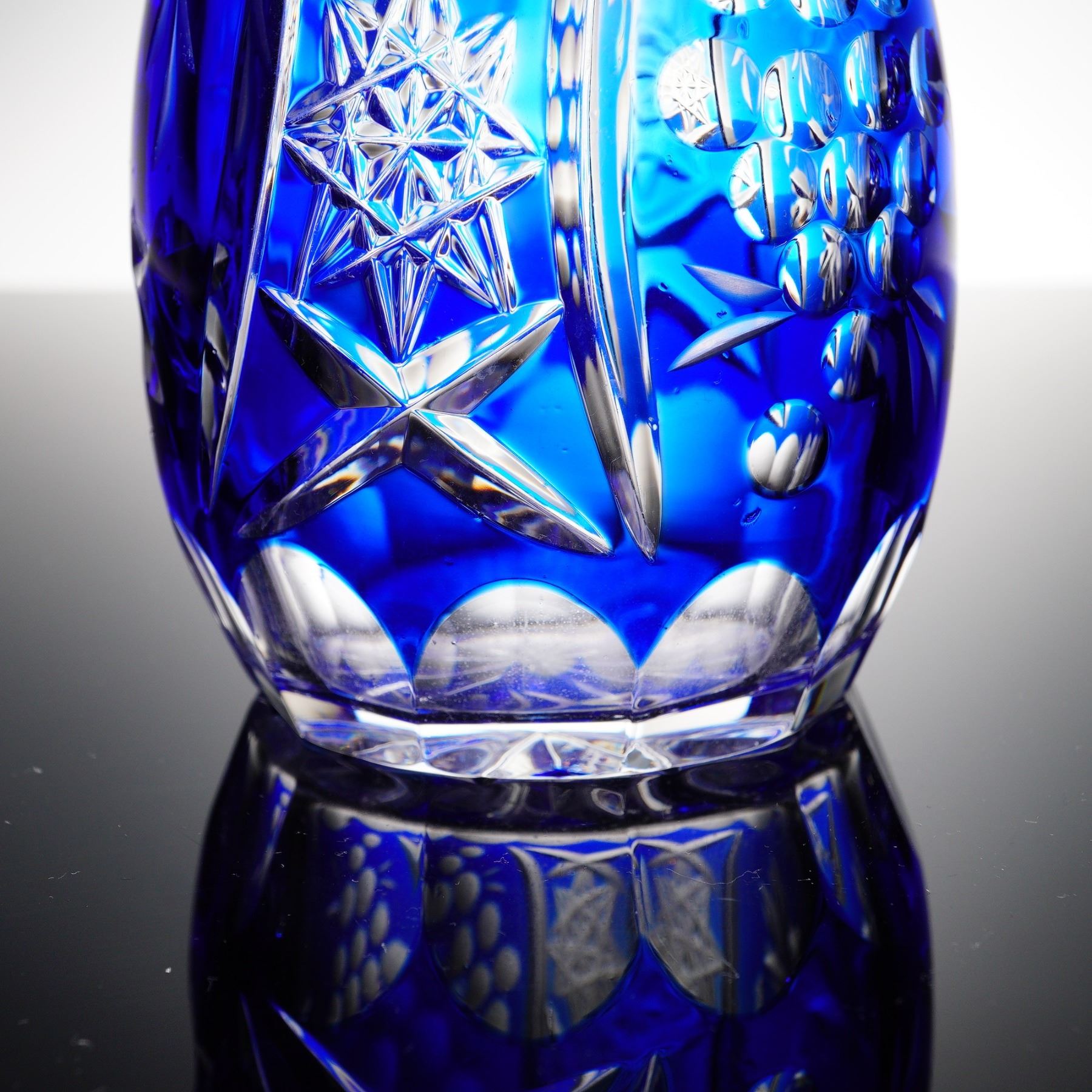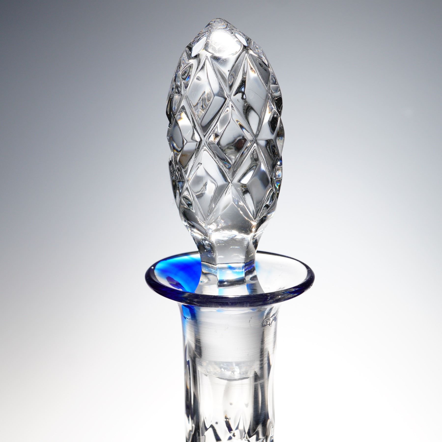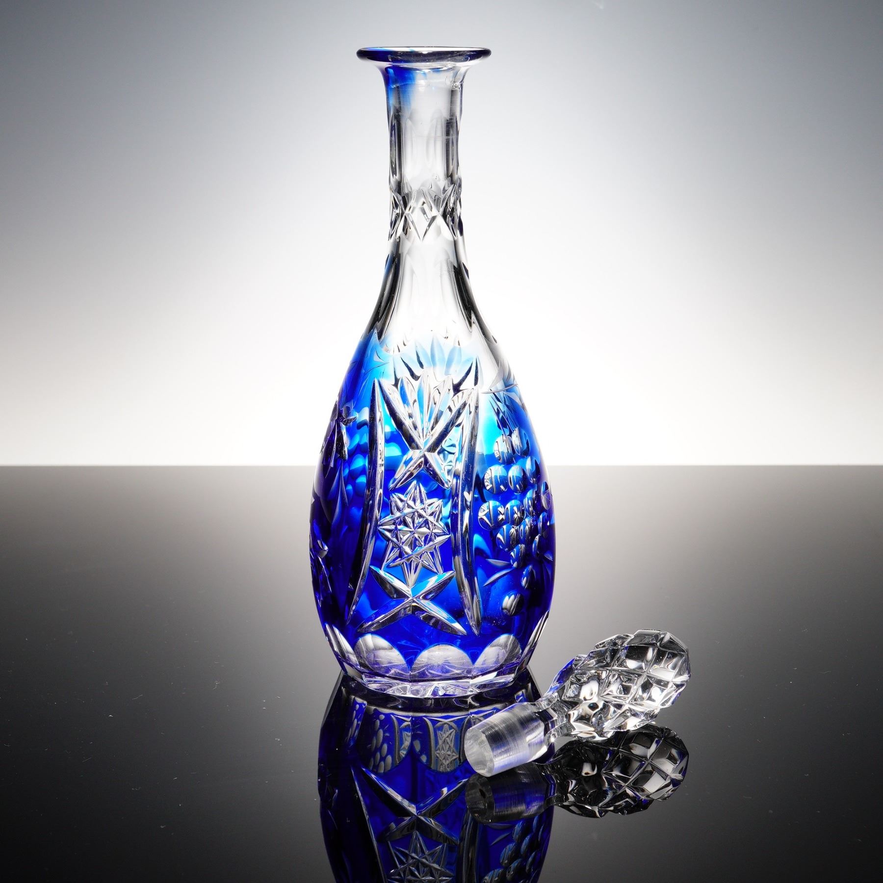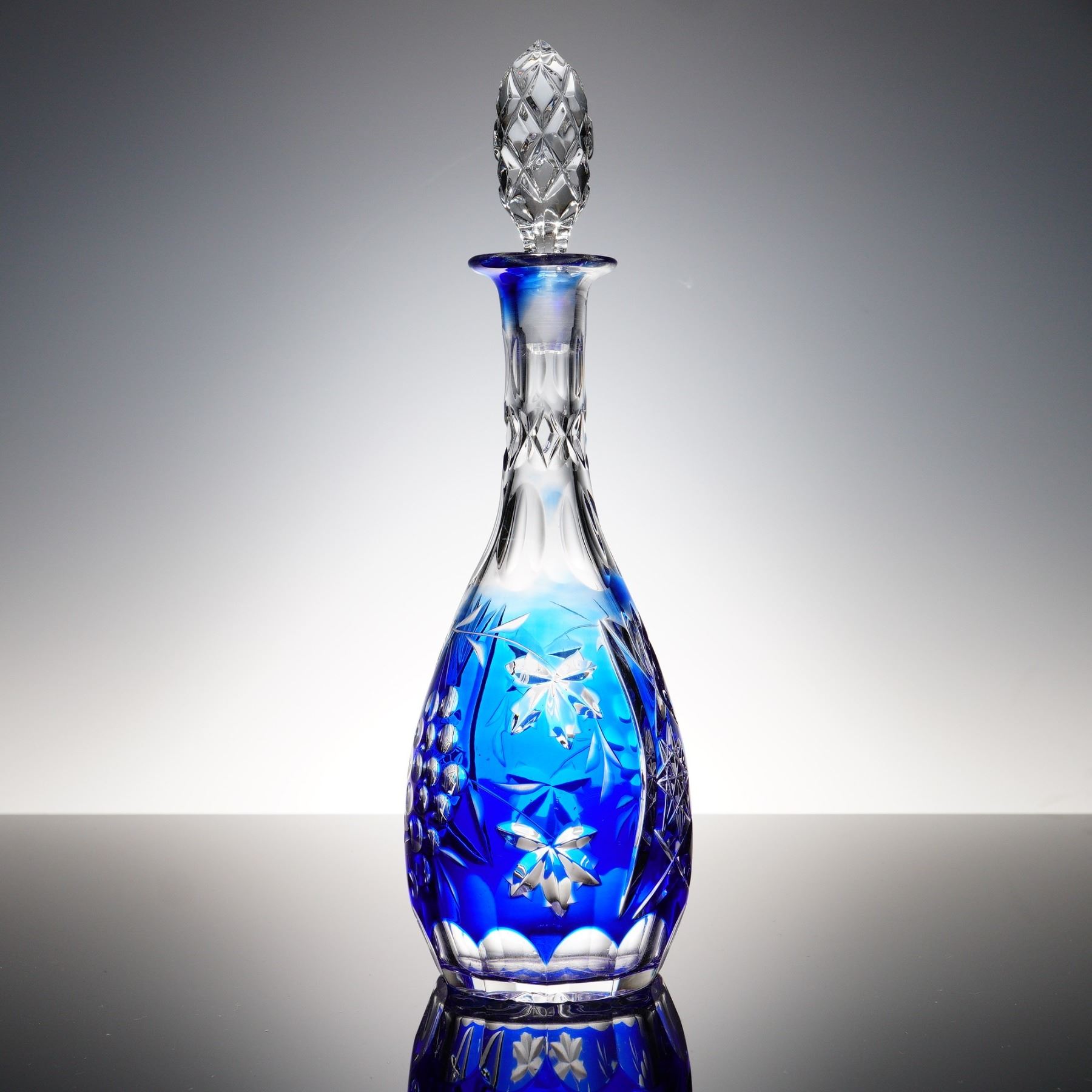 A stunning cut to clear lead crystal decanter in cobalt blue, featuring a long flared neck, teardrop-shaped body, and multi-faceted stopper. The vibrant overlay is deeply cut to reveal floral starbursts, grape clusters, and cross-hatched diamonds in clear crystal, producing dramatic contrast and brilliance. The faceted stopper is pinecone-shaped, echoing the geometric motifs in the body. Likely of Eastern European or Bohemian origin, this decanter makes an exceptional centerpiece or bar accessory.
