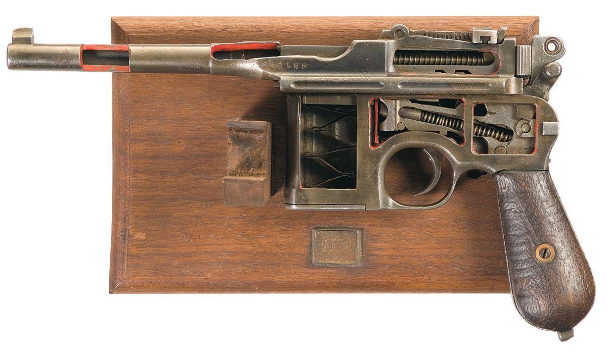 This is a non-factory 1930 Mauser cutaway pistol. The various cuts are made on both sides of the pistol (nine total) and expose all internal working areas of the pistol. Complete with a stand marked "HEINRICH KEPPLER/ SS TOTENKOPFVERBANDE/ 1938".