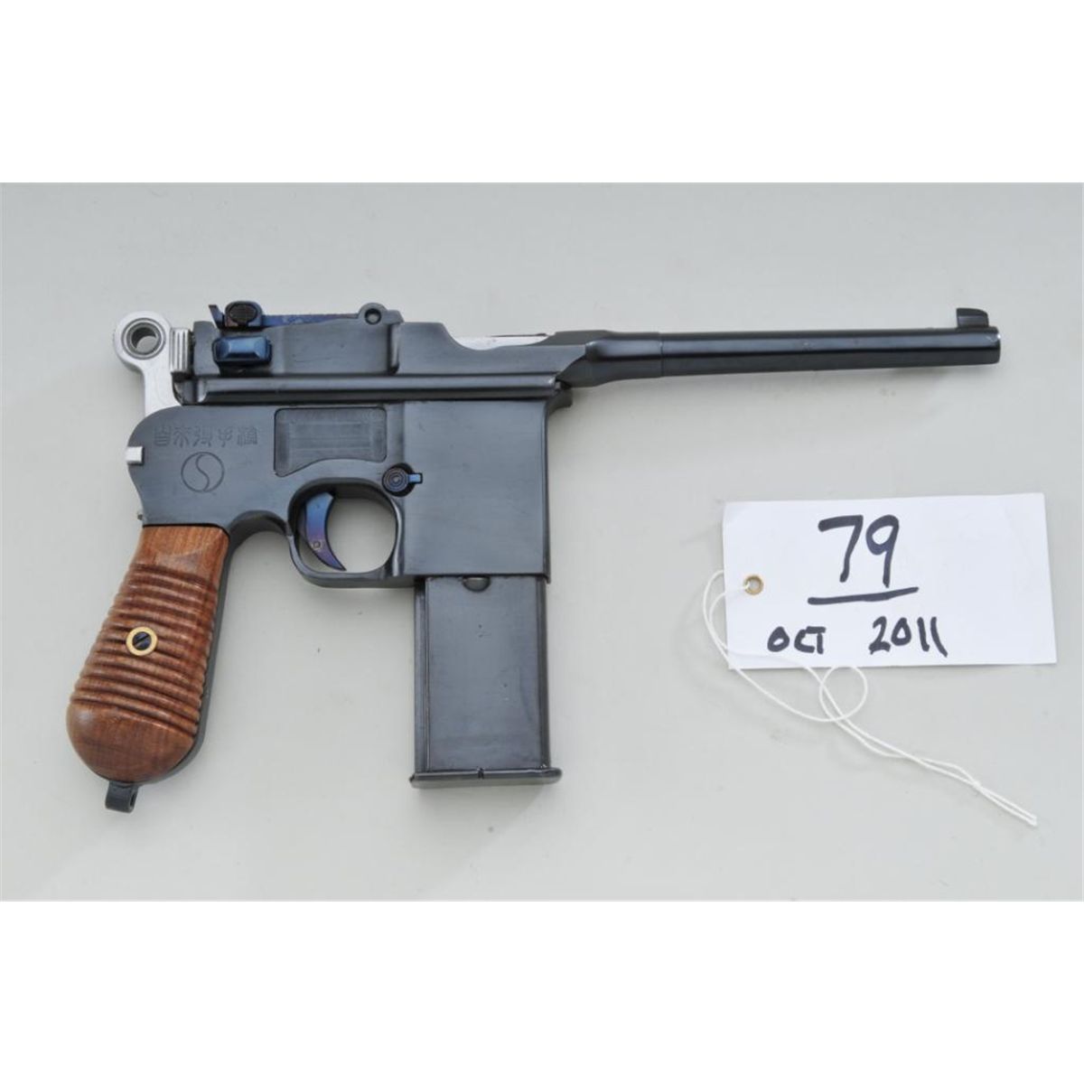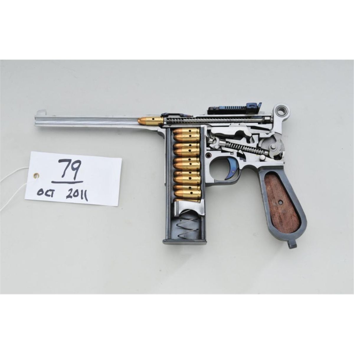 Cutaway demonstration model Chinese Mauser showing internal workings and parts with dummy rounds for .30 caliber Mauser, Chinese markings, wood grips, not a firearm- demonstrator model only. Condition is fine to excellent, great for display in broomhandle or semi-automatic collection. Est: $900 - $1,800