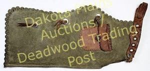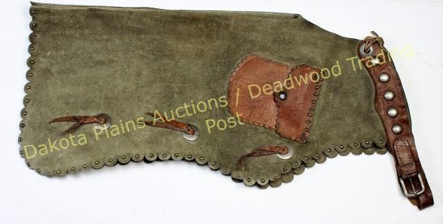 unmarked with spotted belt leather conchos and outside pockets, one snap pulled through on pocket, otherwise very good, 27" long. Est. 100-175