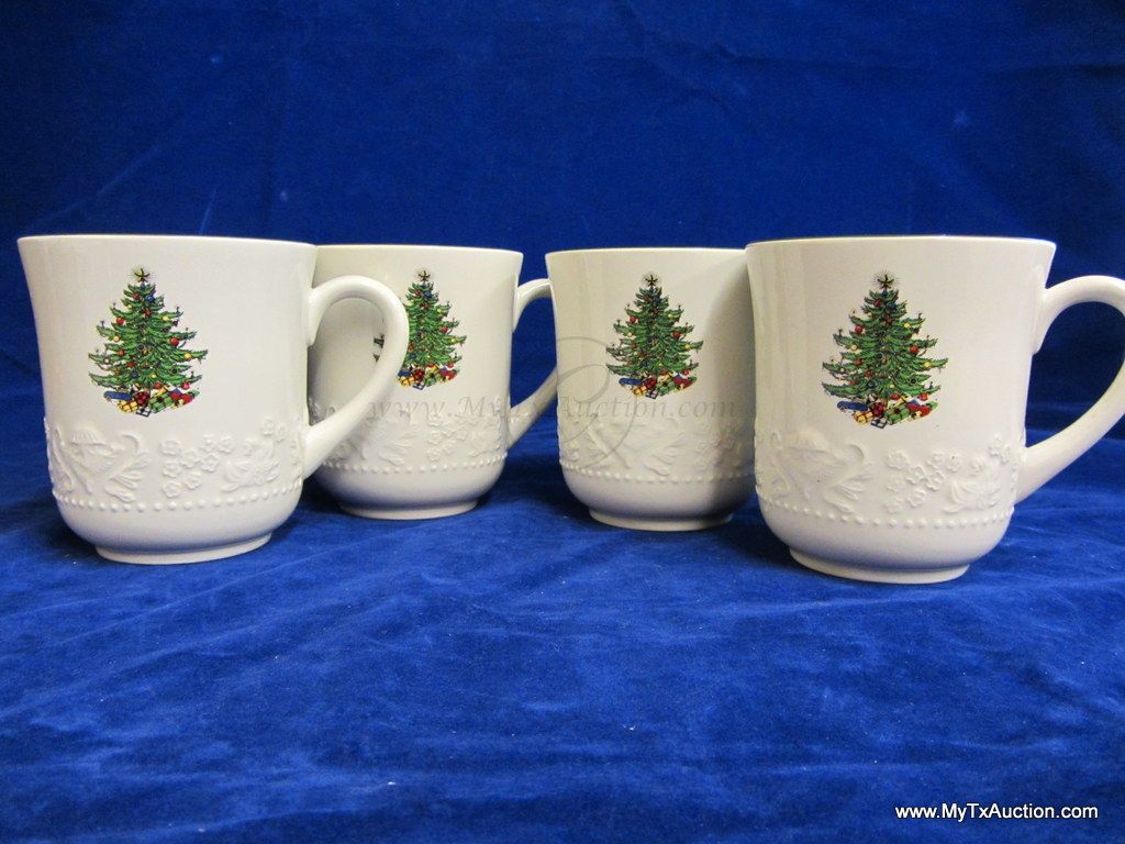 A set of 4 Cuthbertson's Dickens embossed Christmas pattern 3.5" tall Chuthberston is known for having the "Original Christmas Tree" since 1922. 16 years before Spode produced there Christmas tree. Both trees are very similar in style and complement each other beautifully.