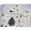 Linen Placemats are cream-colored & measure 12.5" x 19". They have the Original Christmas tree by Cuthberston in the center with packages, holy berries & mistletoe surrounding the tree. Rimmed with red, blue & yellow beaded garland. They are a cotton/Poly Blend, Made in the USA by Royal Linens