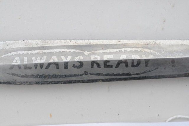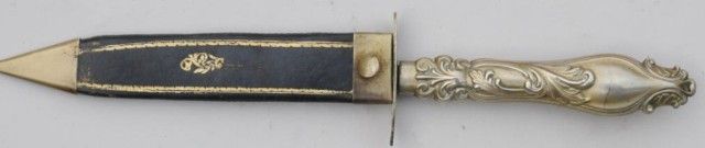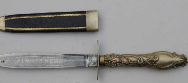 Cutlery gripped spearpoint dirk marked Duthern & Richardson, Sheffield and etched in large black letters, “always ready.” The blade is flared out at tip and measures 6 ¼” , 11 ¼” overall. The blade shows mostoriginal polish and frosty etching. Scabbard is very good plus with button hanger. A strong 8 ½” on 1-10 scale. Est $750-$1500