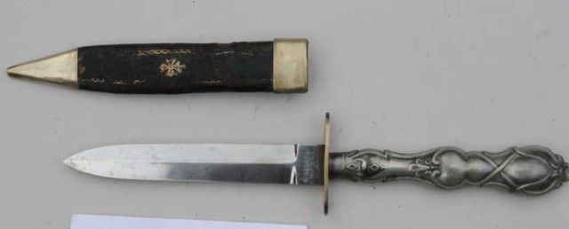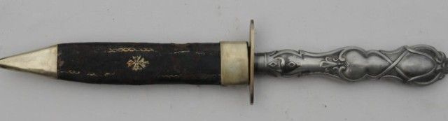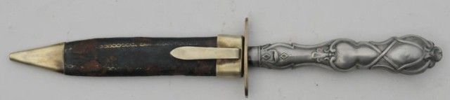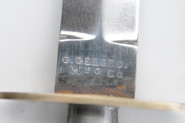 Cutlery handled spear point dirk marked G. Gelston Mfg Co. with pewter grip and original scabbard. Blade and grip near fine with most original polish. Scabbard very good. Est.; $300-$600