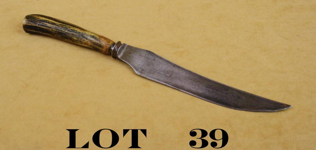 Cutlery-style stag handled knife by Waleham & Yeoman, Cutlers, Sheffield; the knife is approx. 12” overall with an approx. 7” blade that displays an older cleaning , some sharpening and some scattered erosion; nicely worn grip. Est.: $100-$200.