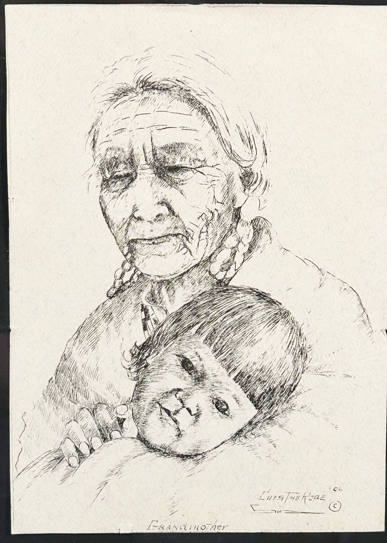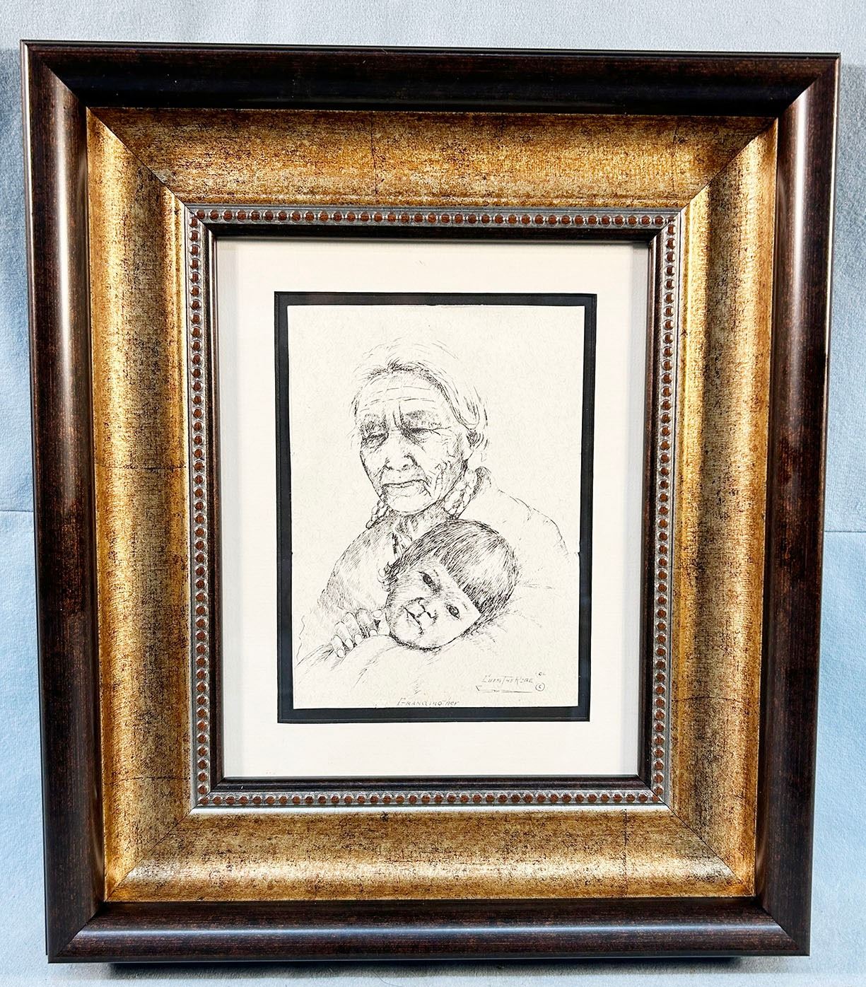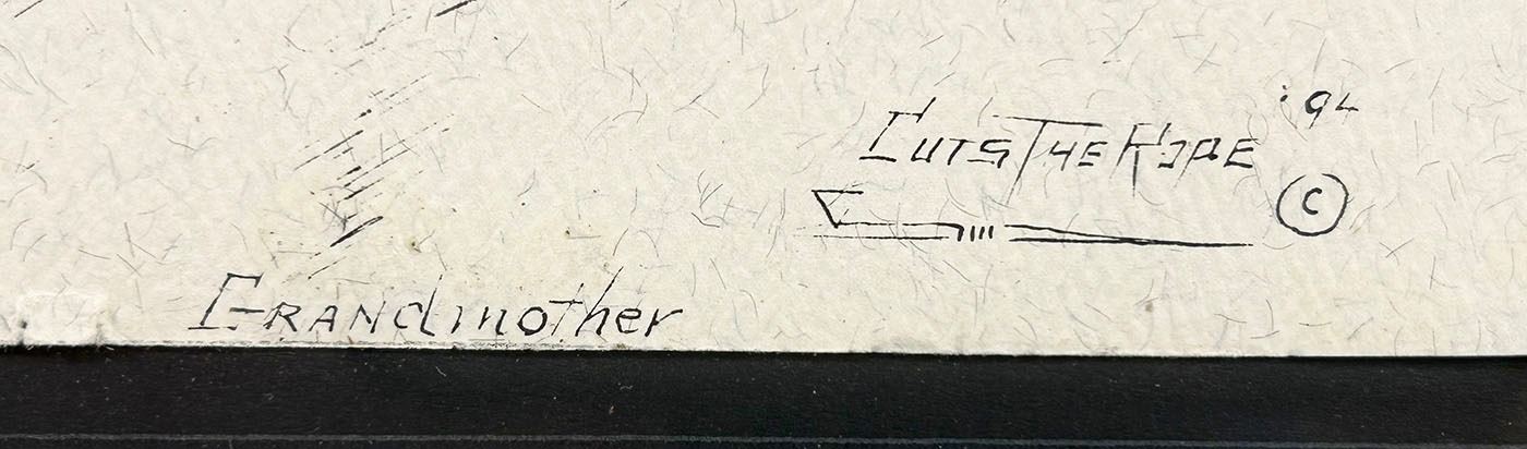 Cuts the Rope, Clarence, original pen & ink, Grandmother, 1994, 7.25" x 5", framed, signed lower right